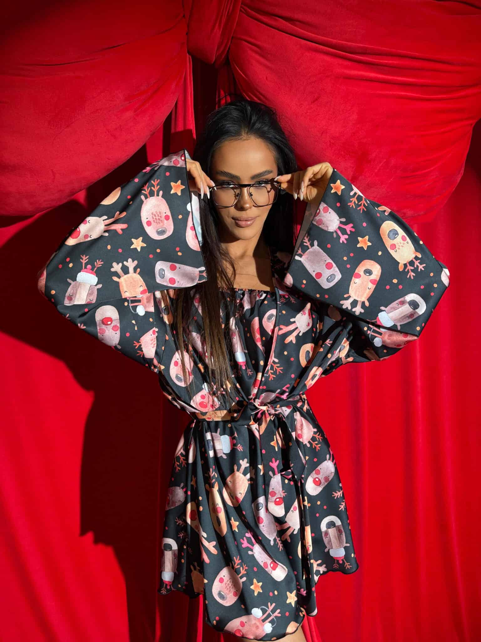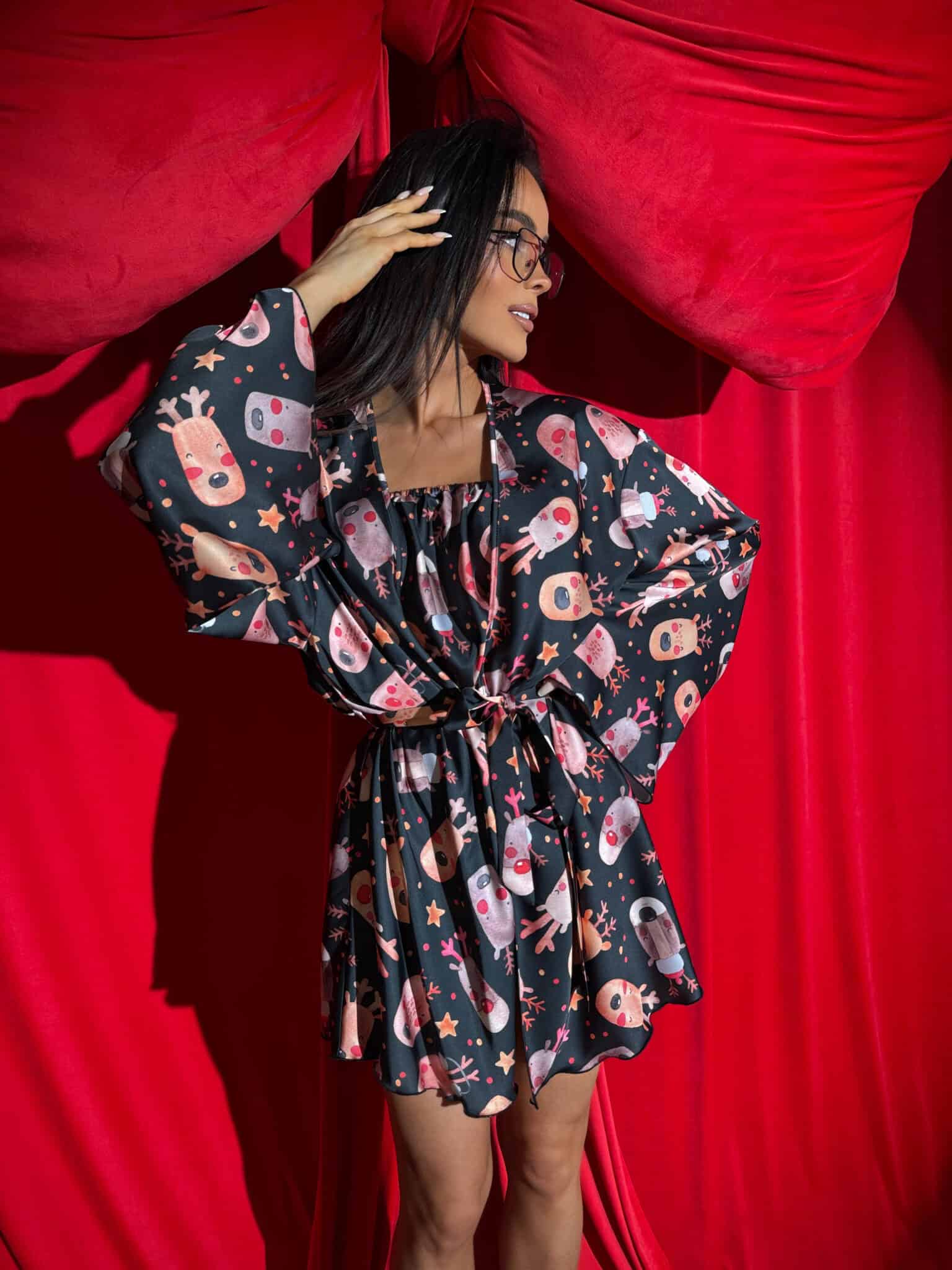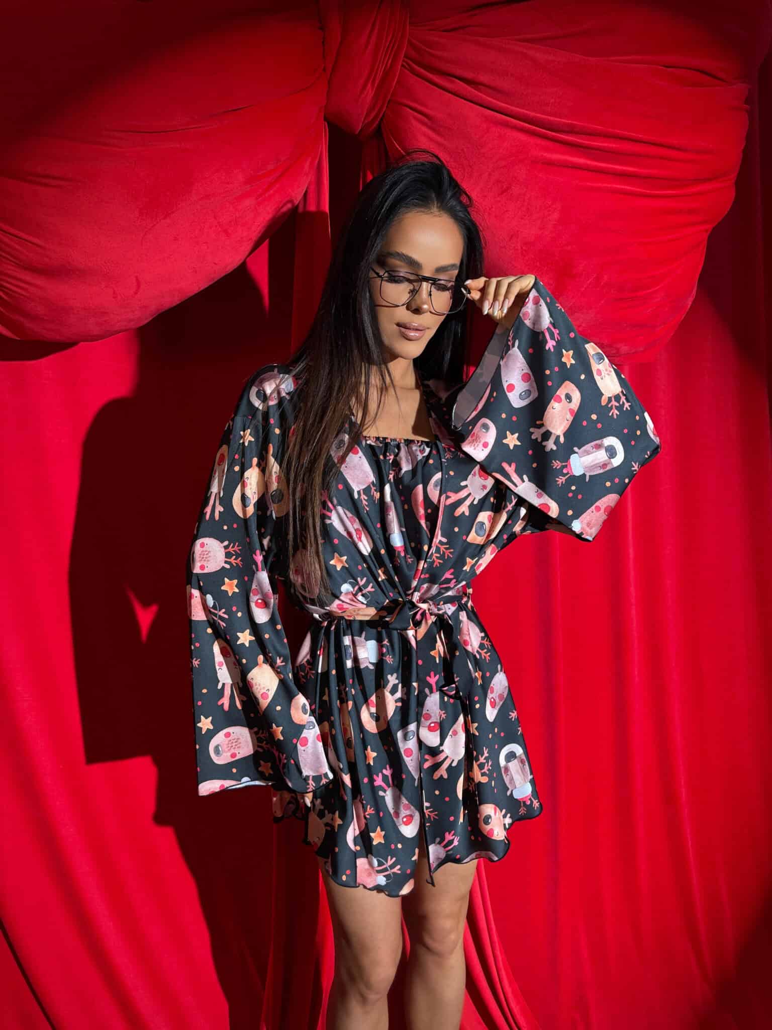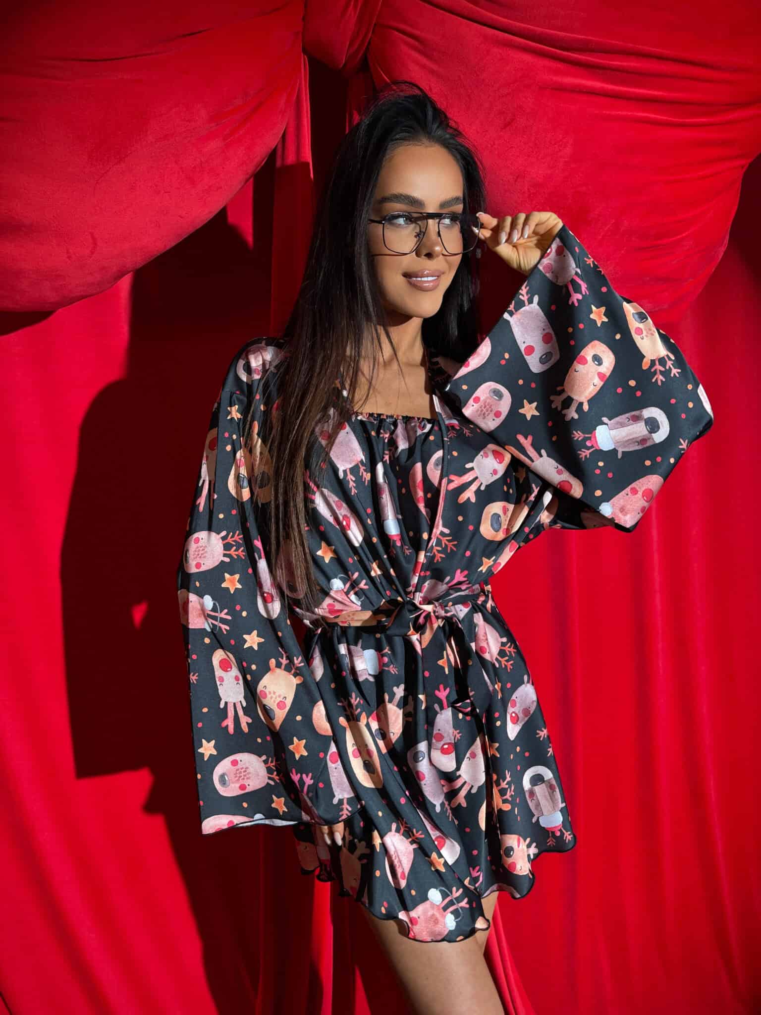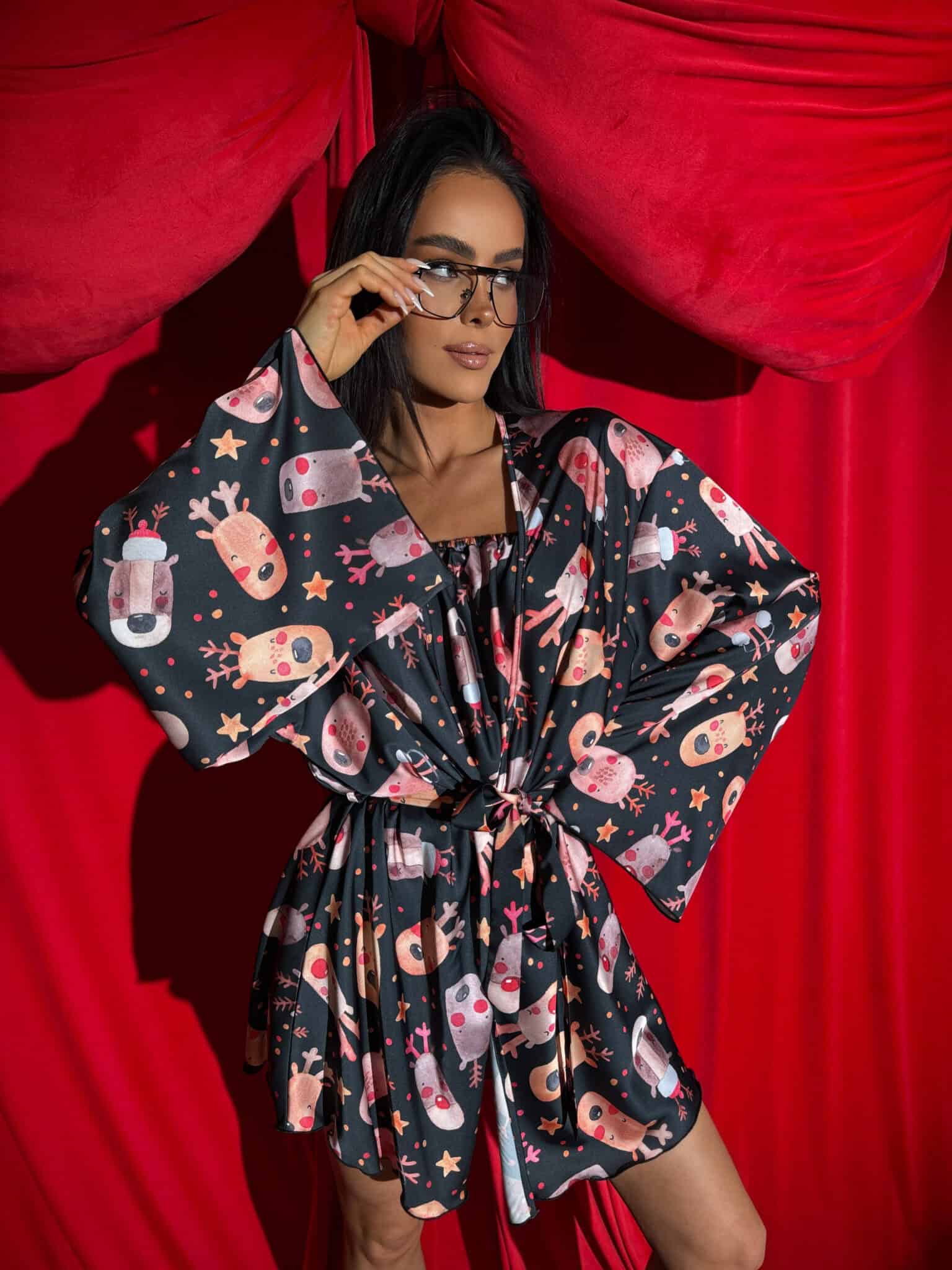 Szlafrok, który wygląda jak prezent sam w sobie. Lekki, zwiewny i pełen uroku – stworzony z myślą o świątecznych porankach, domowej atmosferze i chwilach, które chce się celebrować. Printy w słodkim, zabawnym klimacie dodają mu charakteru i sprawiają, że trudno się nie uśmiechnąć. Wiązanie w talii podkreśla sylwetkę, a oversize’owy fason daje pełen luz i swobodę. Idealny na prezent, dla siebie lub dla kogoś, kto zasługuje na coś wyjątkowego. LAMANUEL w wersji cute – totalnie do pokochania.Skład: 100% poliester