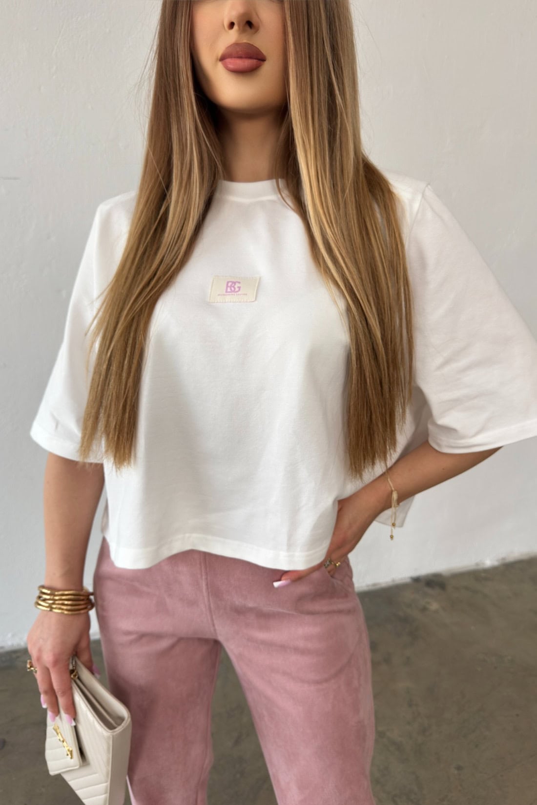 Opis produktu: T-shirt BG ESME z wysokiej jakości bawełny z domieszką elastanu. Posiada elegancką naszywkę z logo marki BG Brandenburg Couture na środku. T-shirt o szerszym kroju. Dodatkowo poduszki w ramionach.