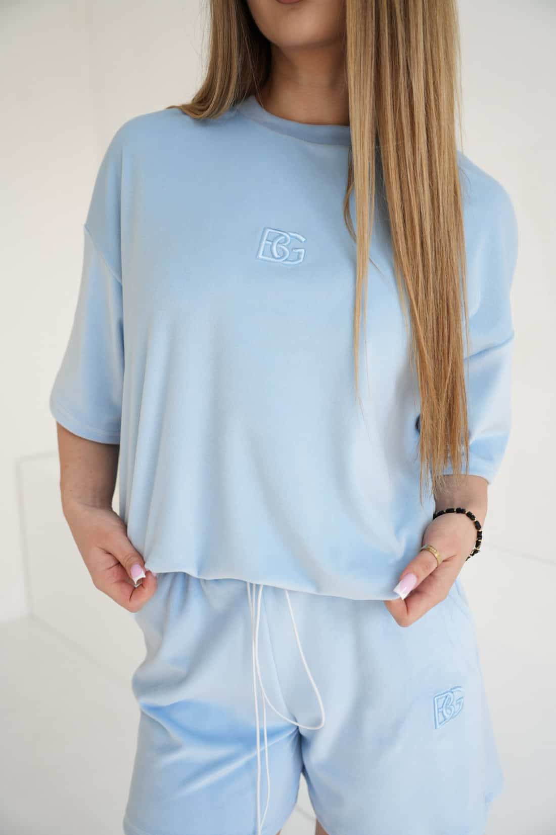 Damski welurowy t-shirt – styl i wygoda w nowoczesnym wydaniu. Miękki, przyjemny w dotyku materiał zapewnia komfort noszenia, a gumosznurek u dołu pozwala na regulację i dopasowanie fasonu. Idealny do codziennych, casualowych stylizacji.