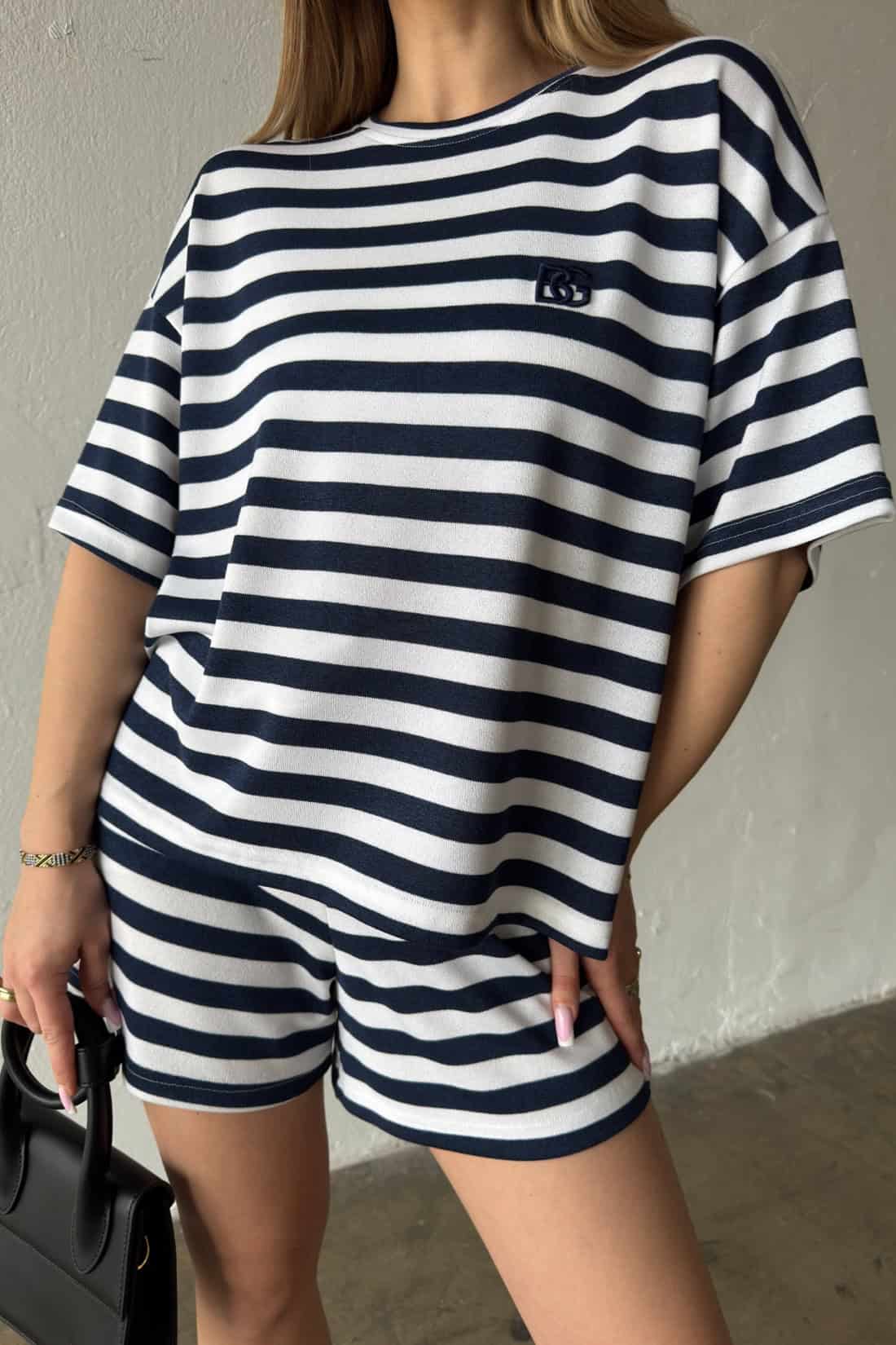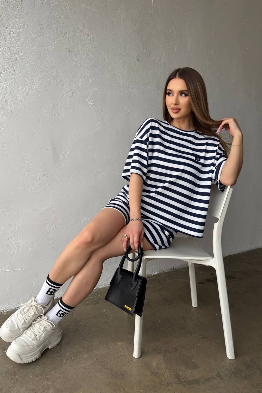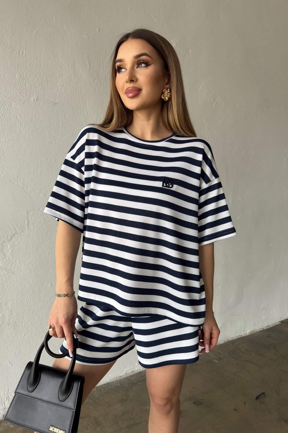 Opis produktu: T-shirt damski BG TOM z wysokiej jakości wiskozowej dzianiny sweterkowej. T-shirt o luźnym kroju. Na sercu logowanie monogramem BG w tonacji pasków. Model oversize.