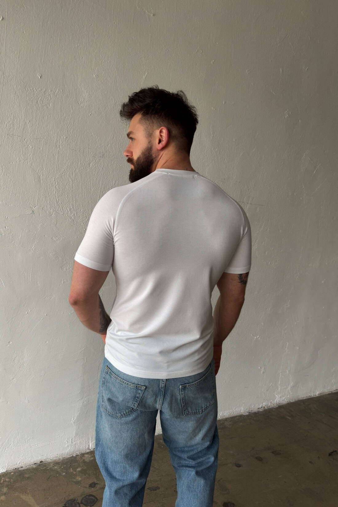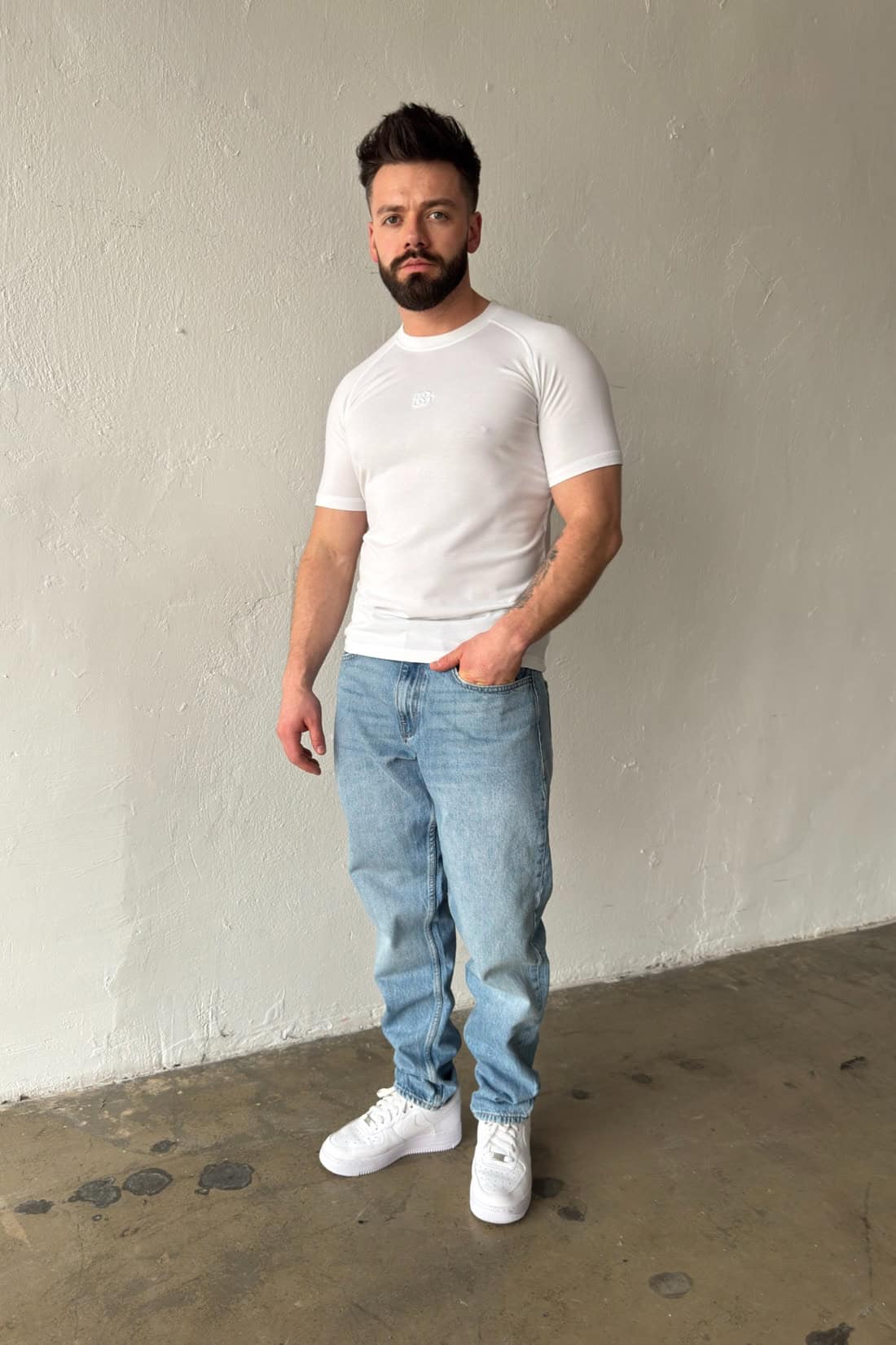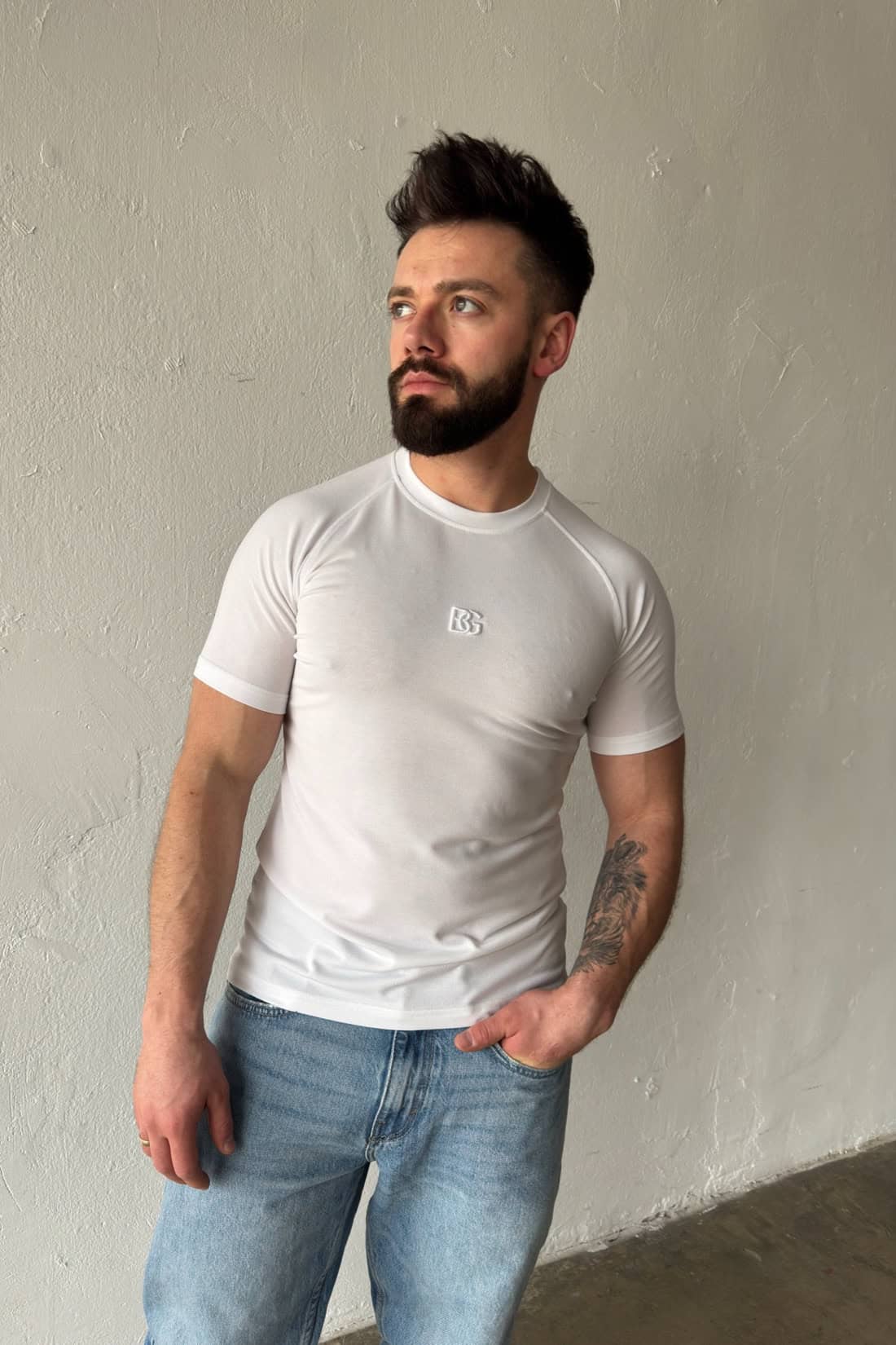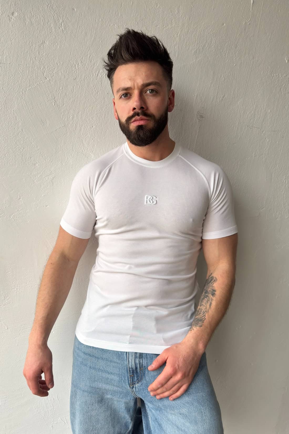Opis produktu: T-shirt męski BG LIGHT wykonany z wysokiej jakości wiskozowej dzianiny sweterkowej. T-shirt logowany monogramem marki BG na środku klatki w tonacji materiału. Dopasowany krój oraz reglanowy rękaw podkreślają sylwetkę.