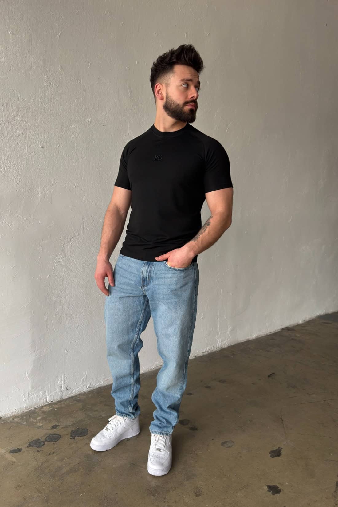 Opis produktu: T-shirt męski BG LIGHT wykonany z wysokiej jakości wiskozowej dzianiny sweterkowej. T-shirt logowany monogramem marki BG na środku klatki w tonacji materiału. Dopasowany krój oraz reglanowy rękaw podkreślają sylwetkę.