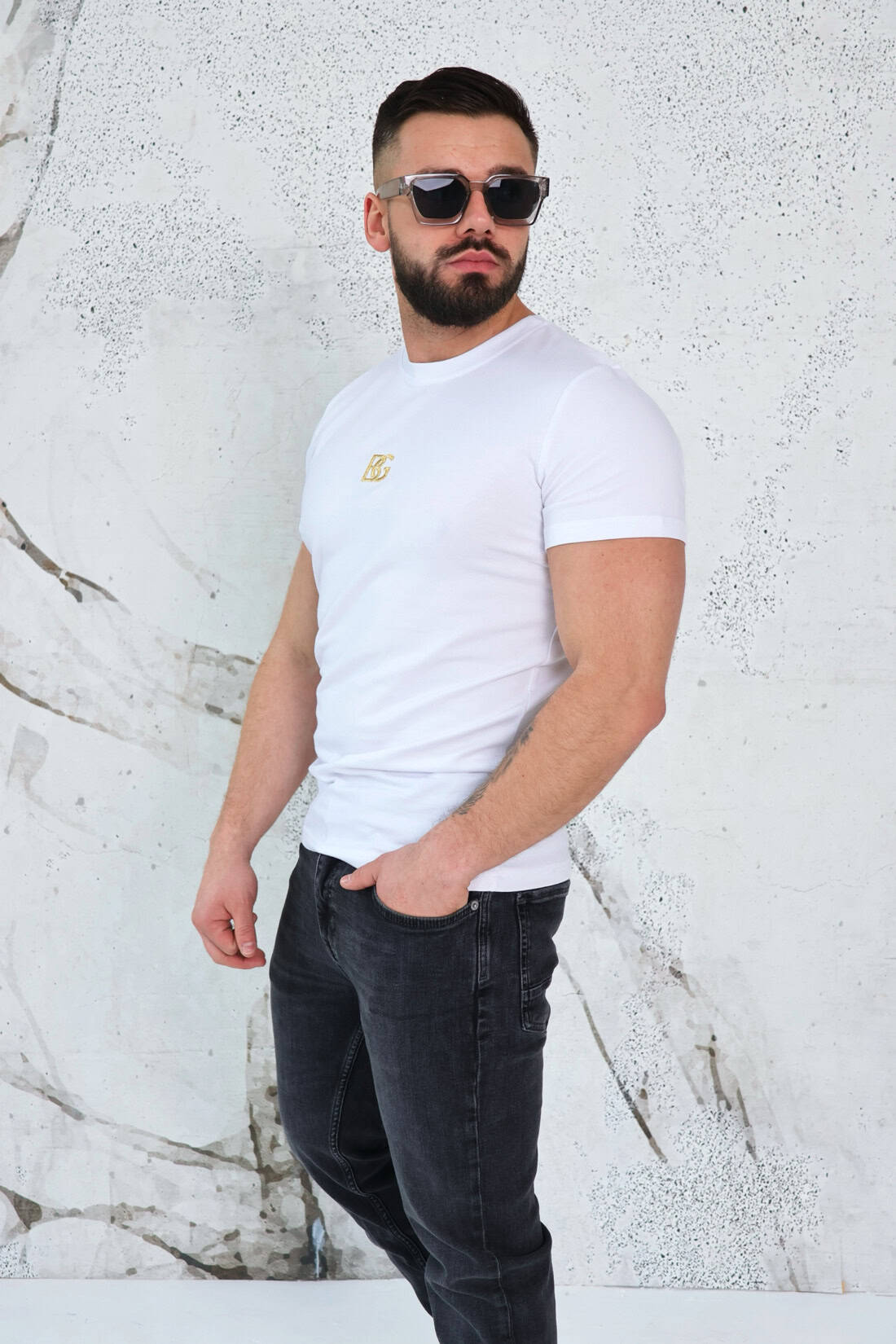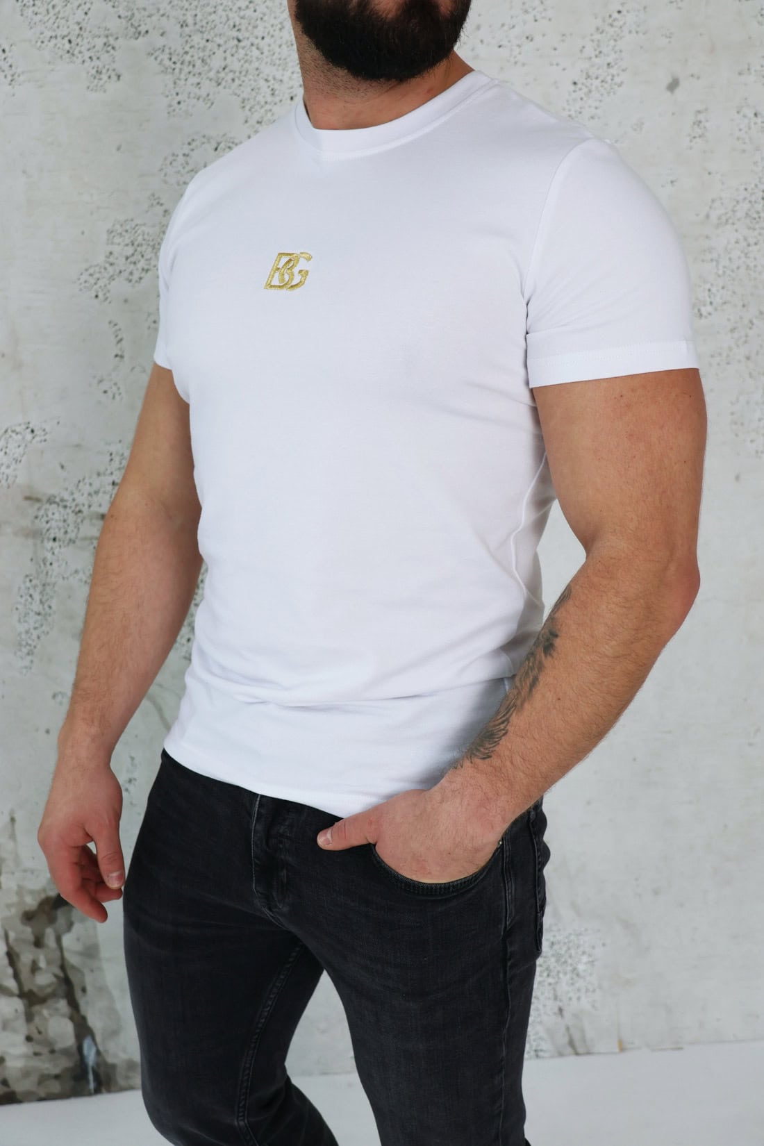 Opis produktu: Klasyczny T-shirt BG PRAY z wysokiej jakości bawełny z domieszką elastanu. Posiada logowanie marki BG na środku klatki w kolorze złotym.