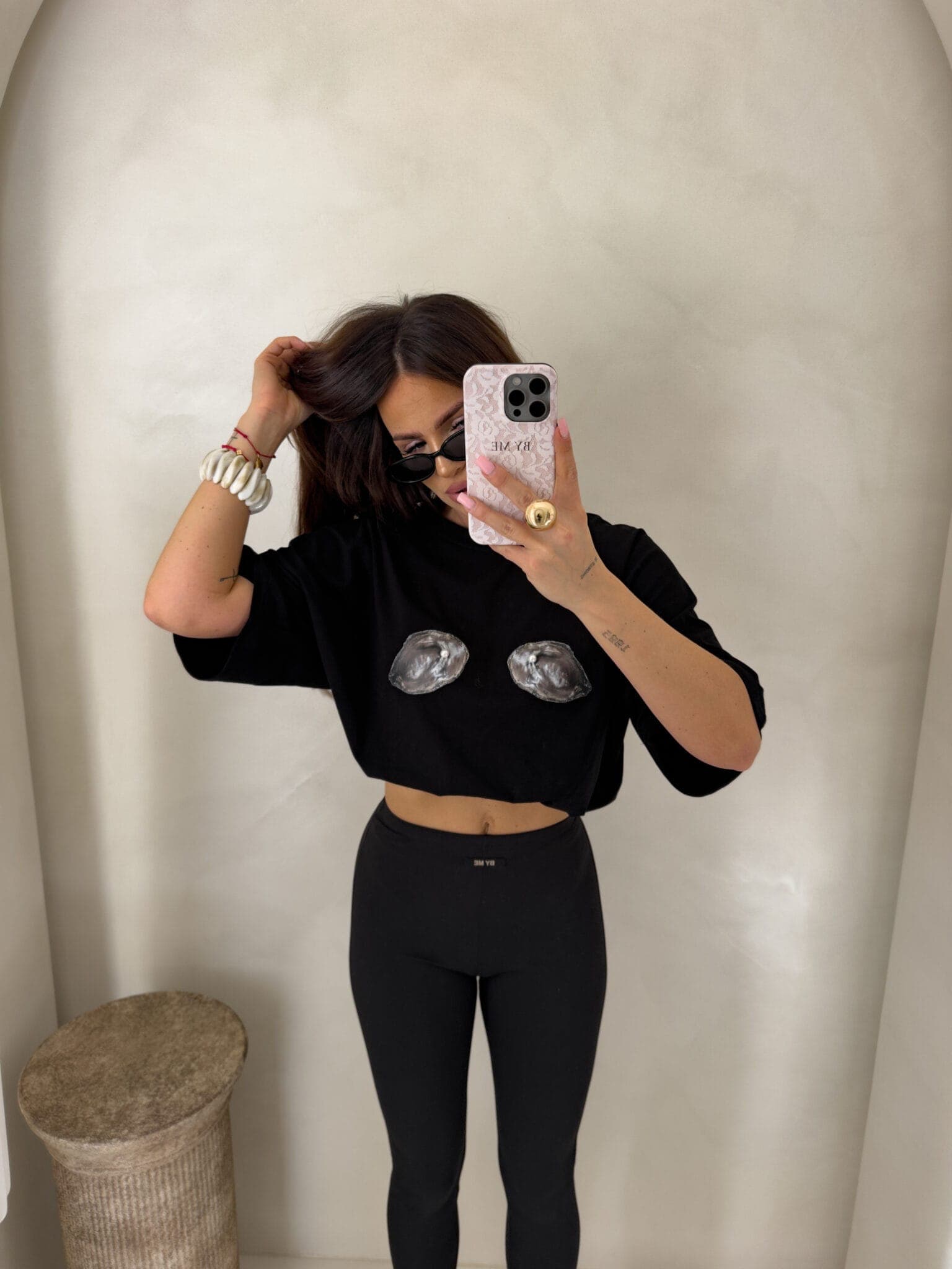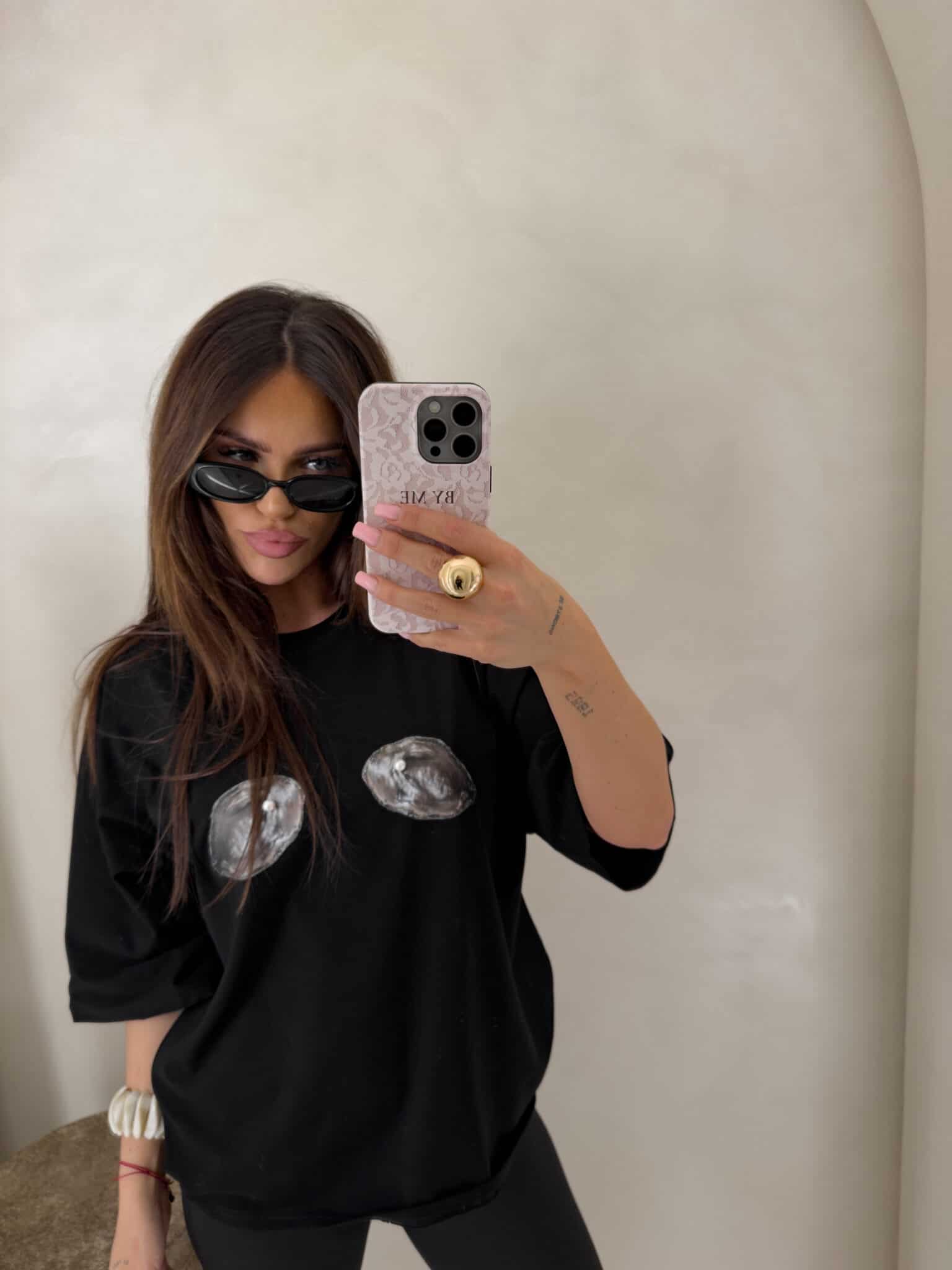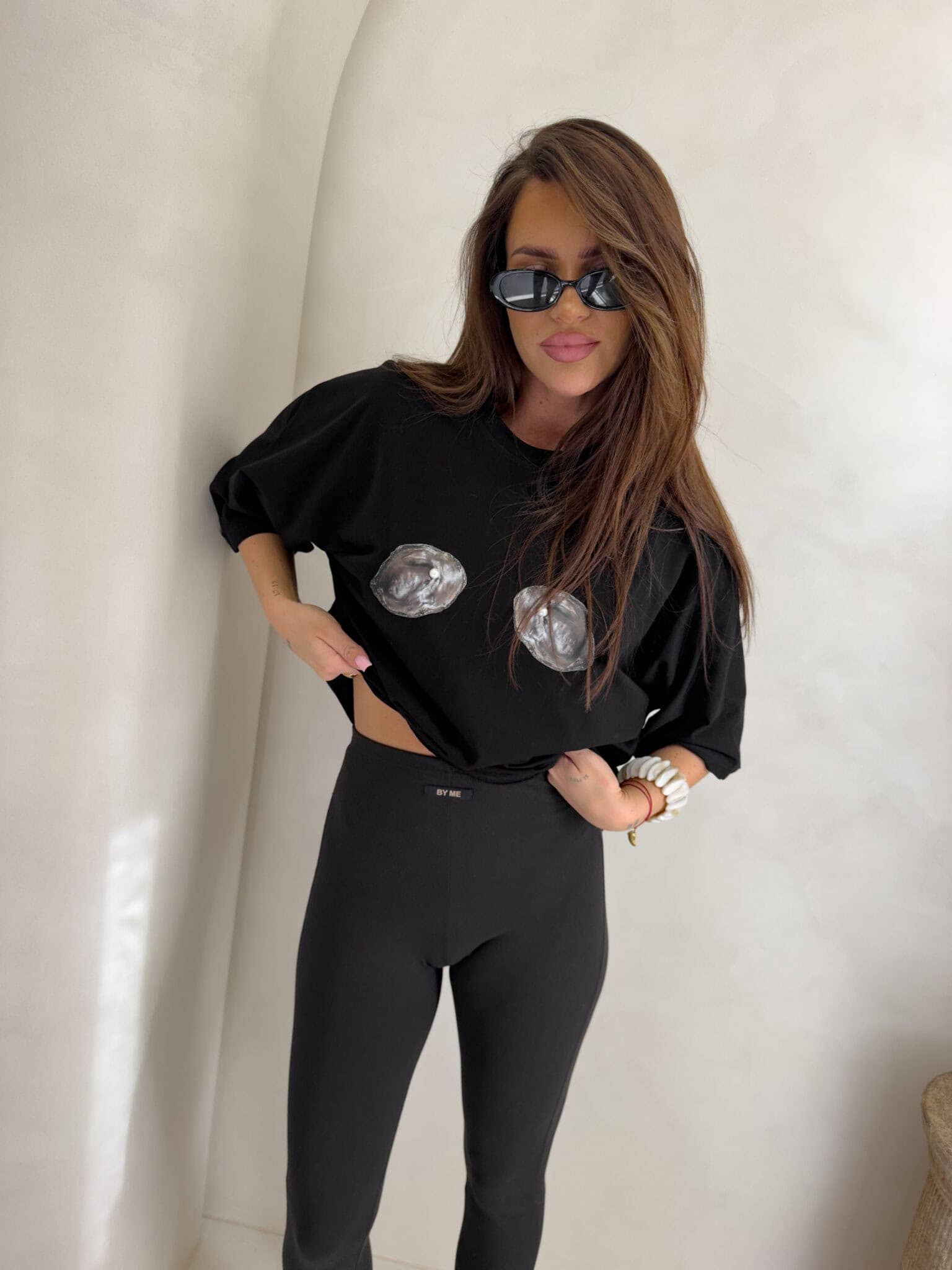 T-shirt o luźnym, oversize’owym kroju z szerokimi rękawami. Dekolt jest klasyczny, okrągły. Na przodzie znajduje się efektowna aplikacja z motywem muszli z perełkami, która nadaje koszulce wyjątkowego charakteru. Idealny do codziennych, modnych stylizacji.