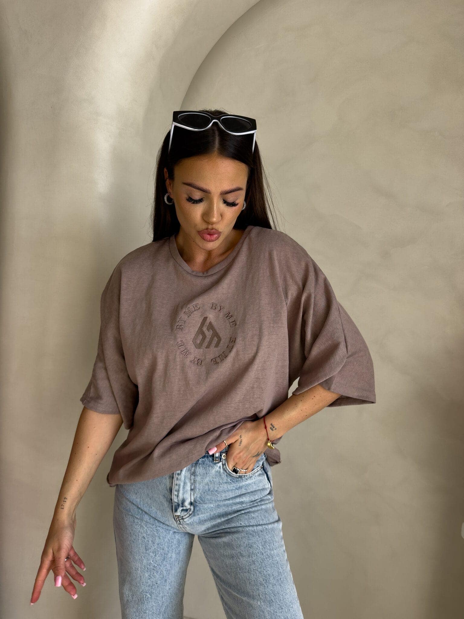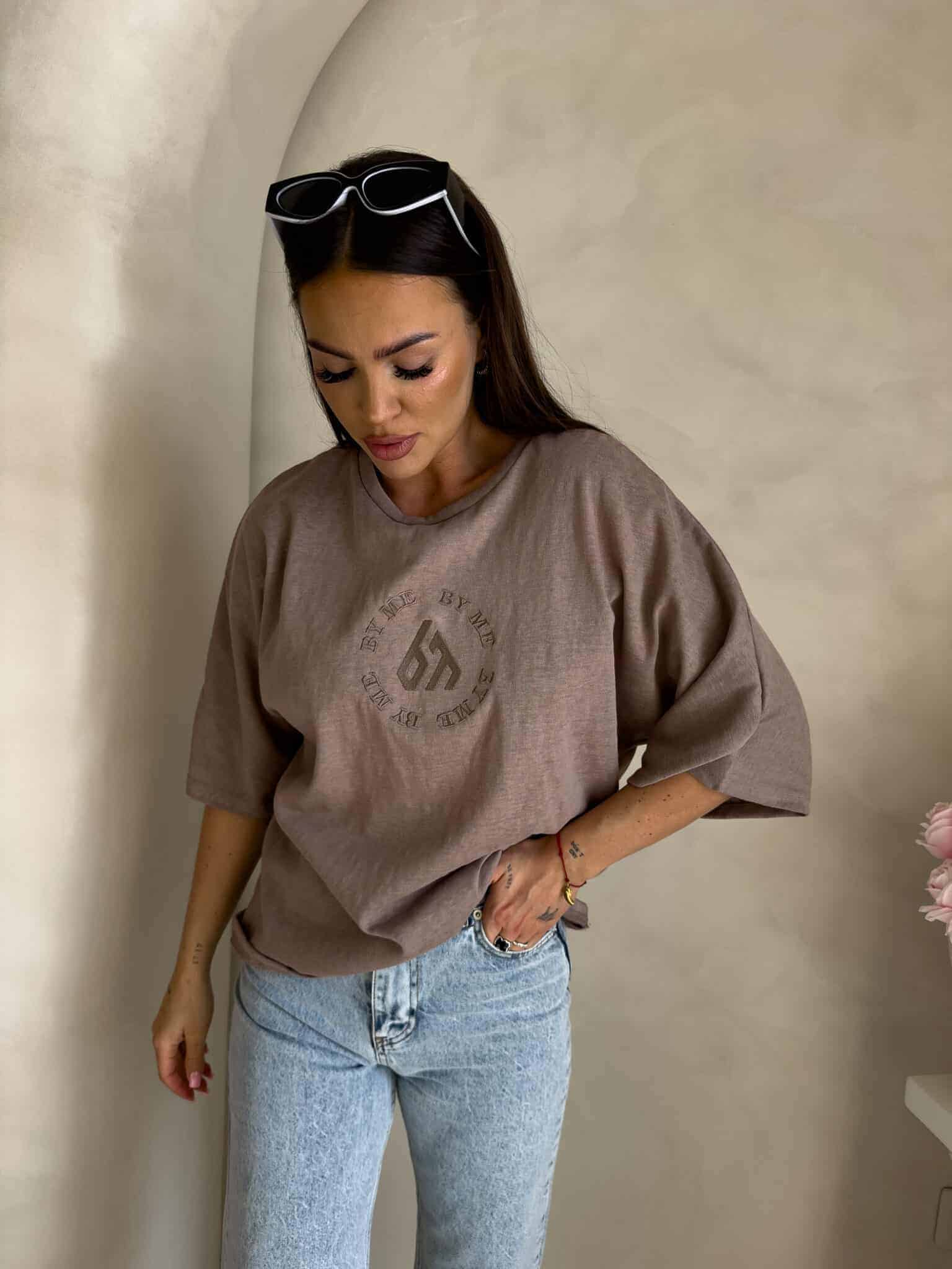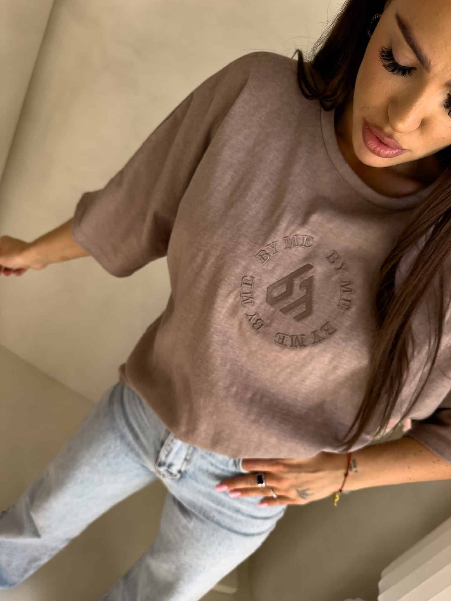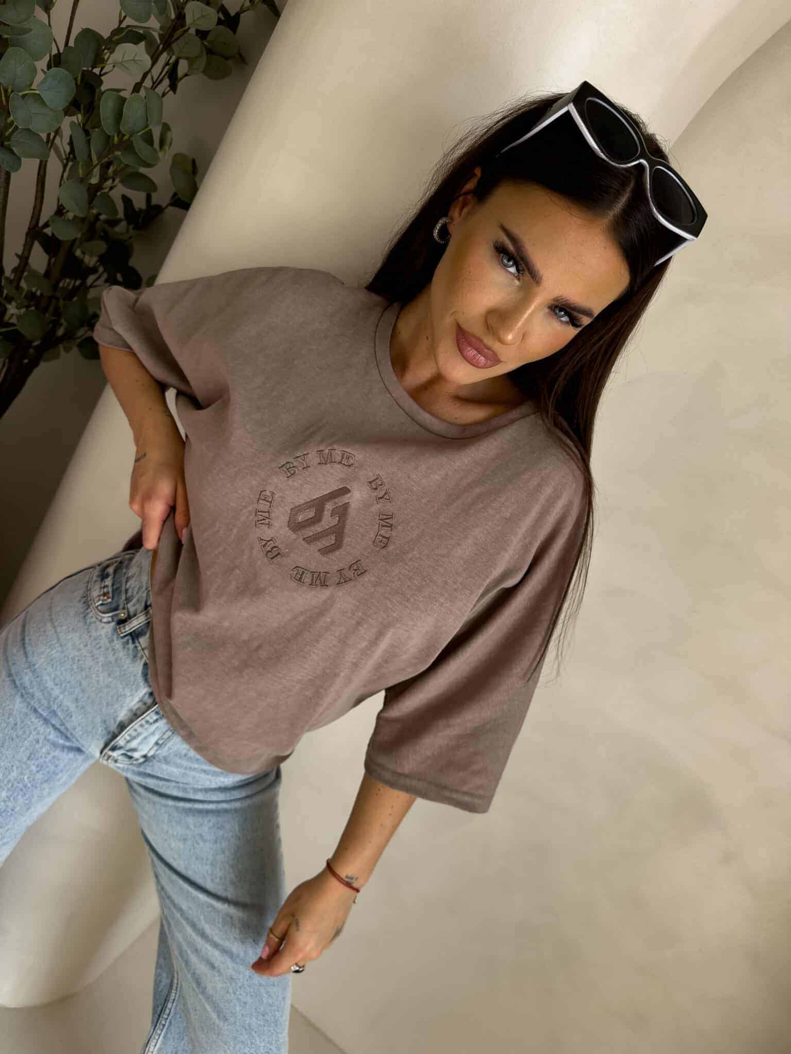 T-shirt o luźnym, oversize’owym kroju z szerokimi rękawami. Na środku znajduje się subtelne logo – okrągły nadruk z napisem „BY ME” oraz minimalistycznym symbolem w środku. Dekolt jest klasyczny, okrągły.