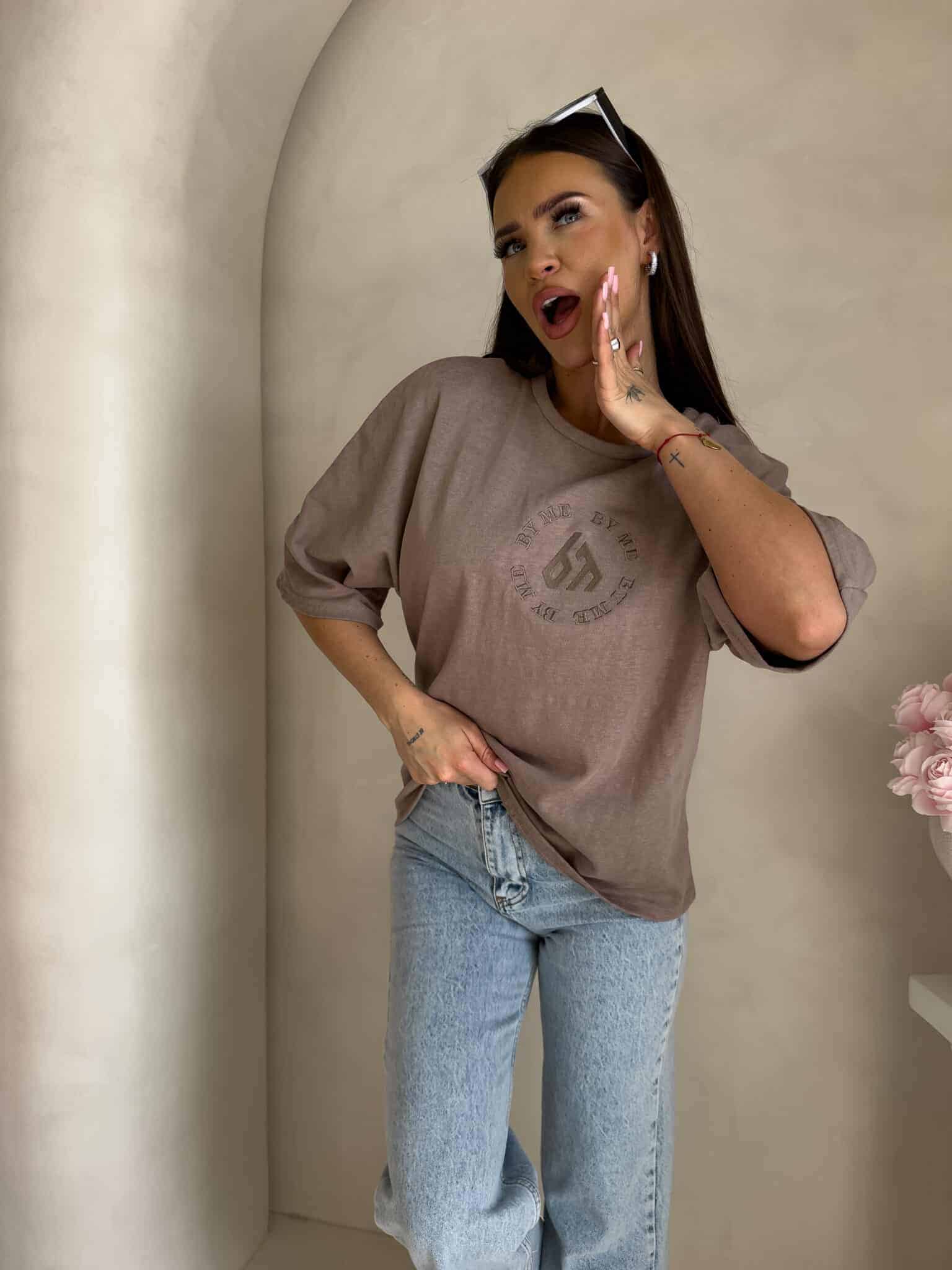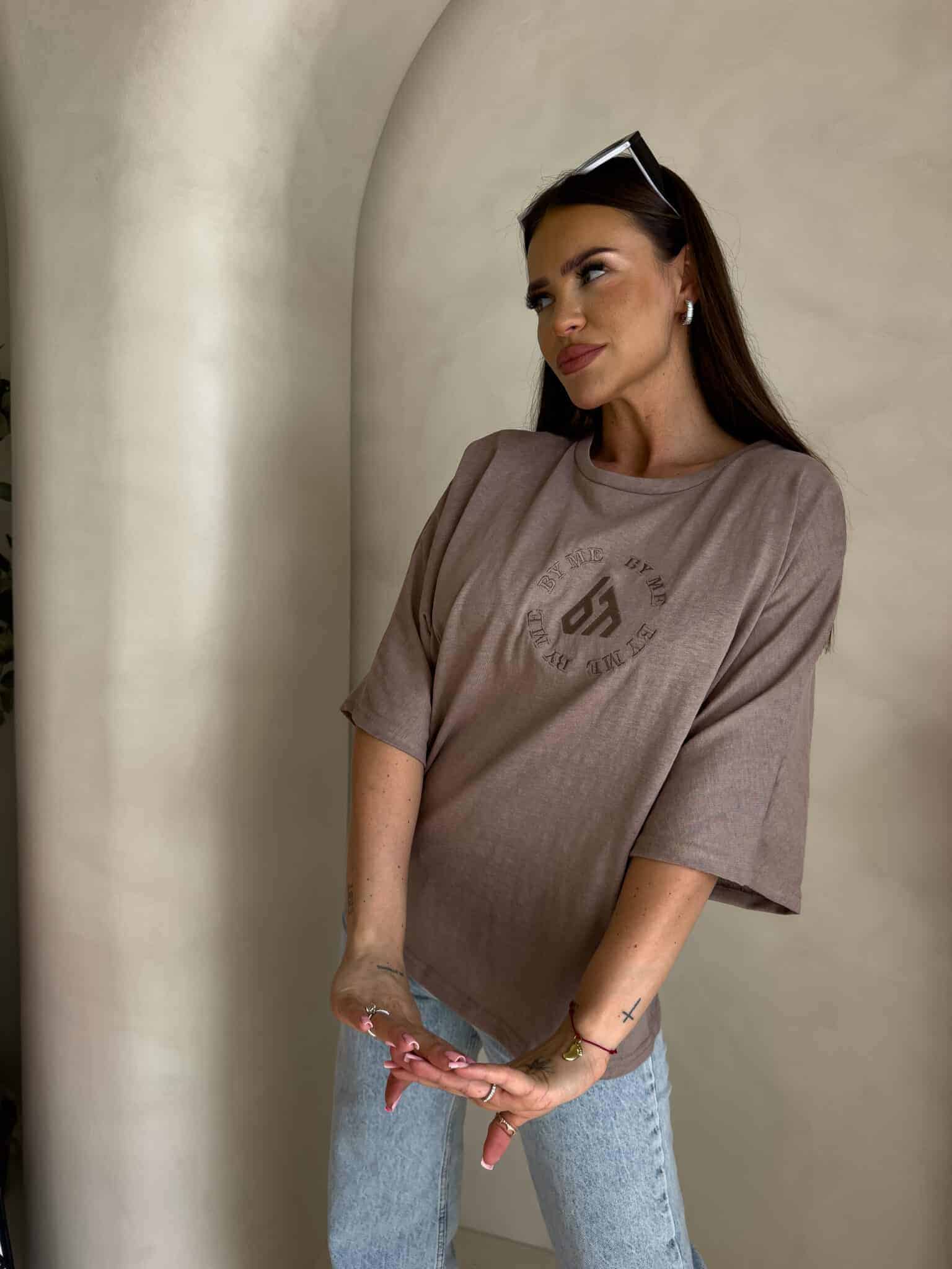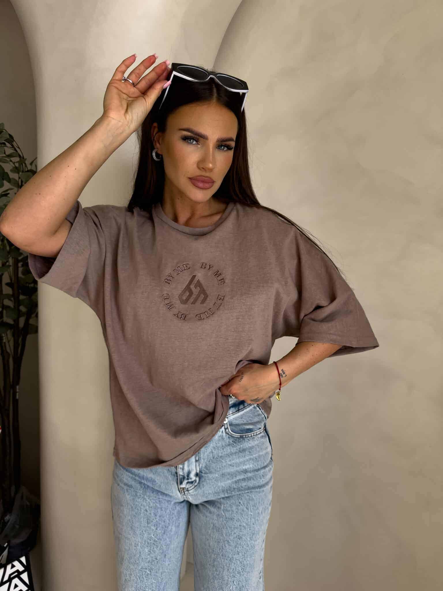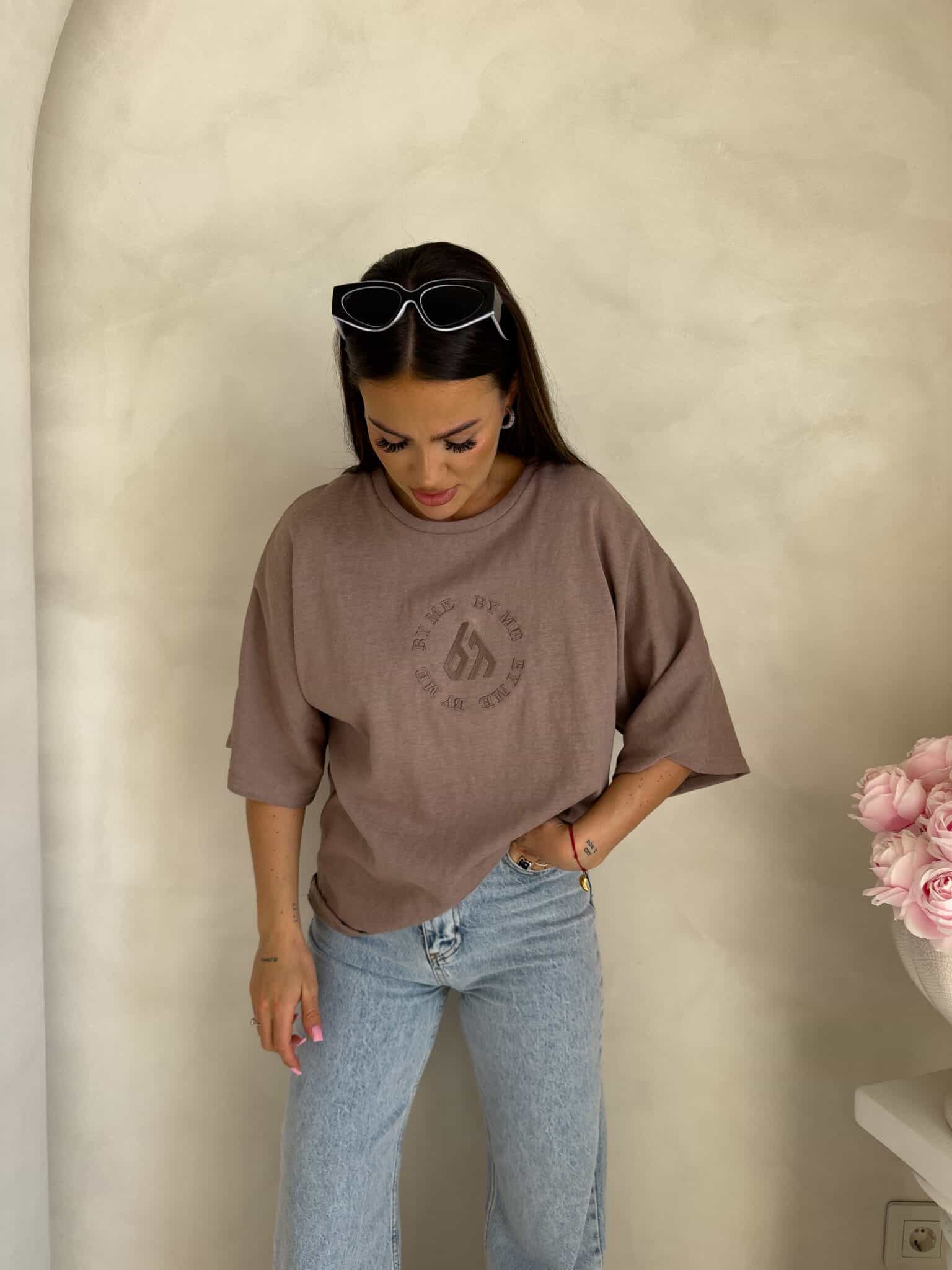 T-shirt o luźnym, oversize’owym kroju z szerokimi rękawami. Na środku znajduje się subtelne logo – okrągły nadruk z napisem „BY ME” oraz minimalistycznym symbolem w środku. Dekolt jest klasyczny, okrągły.