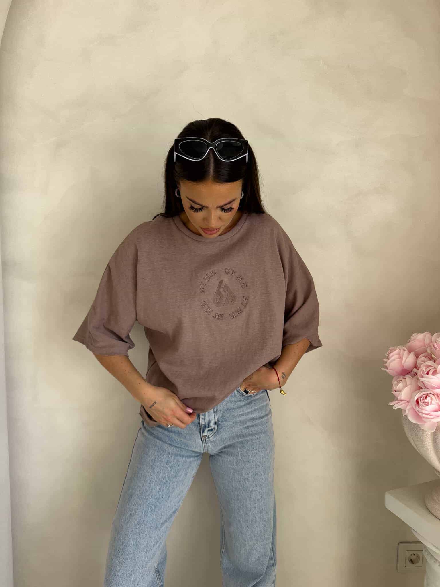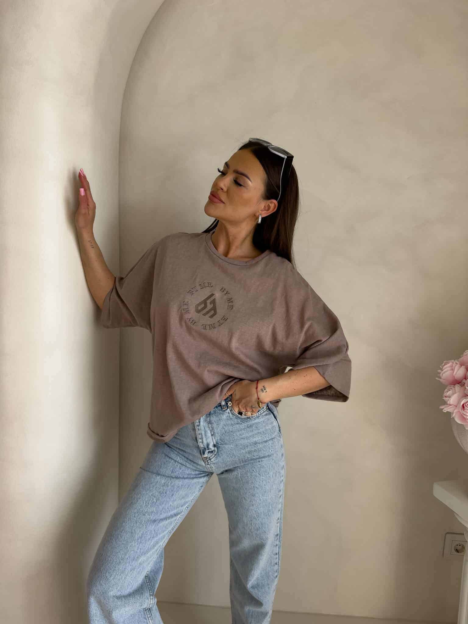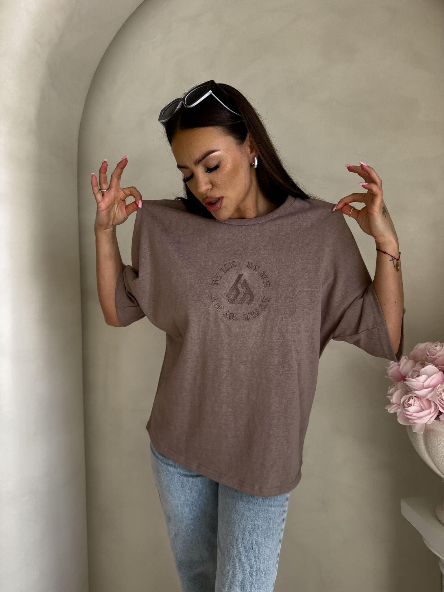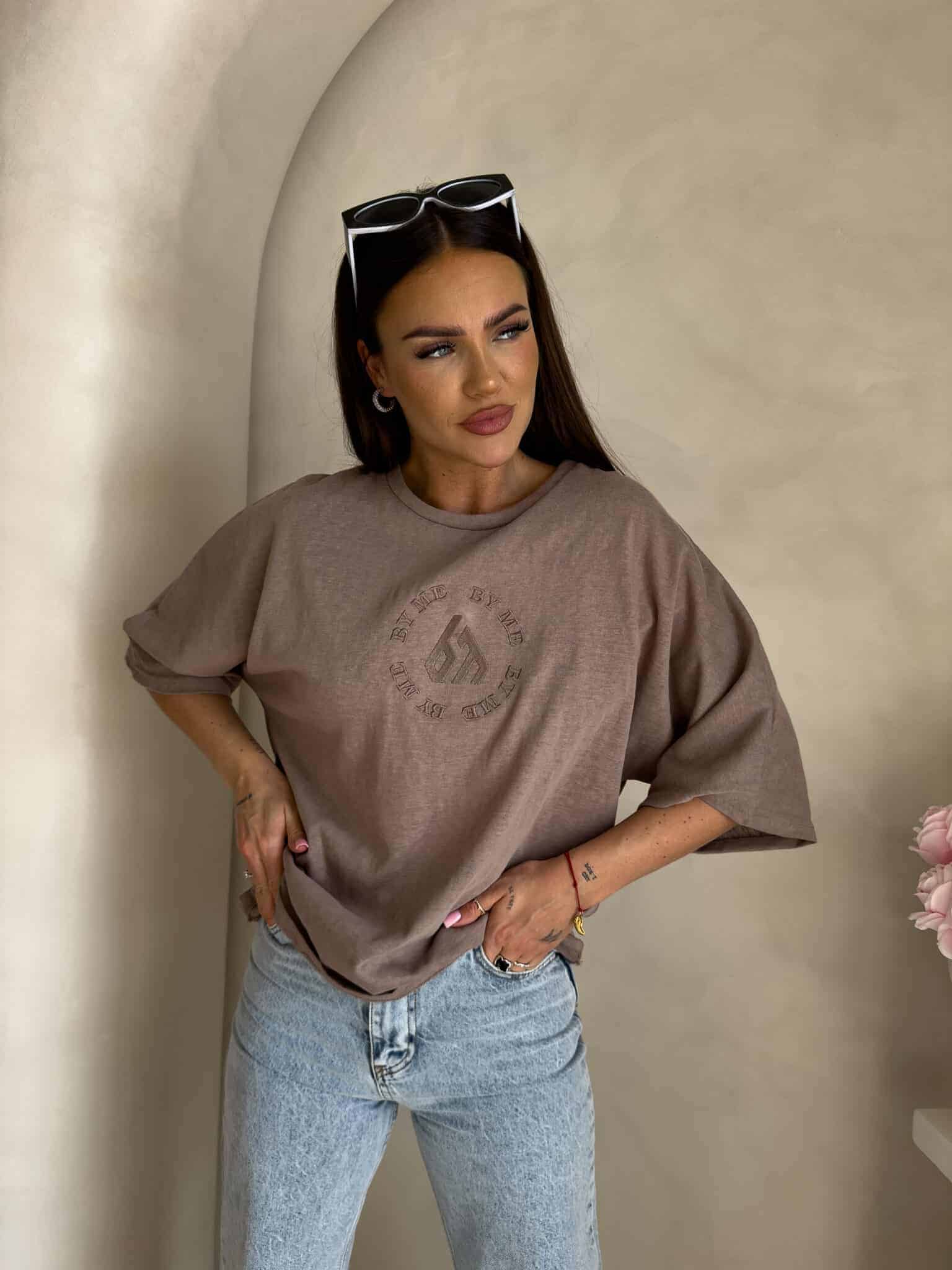 T-shirt o luźnym, oversize’owym kroju z szerokimi rękawami. Na środku znajduje się subtelne logo – okrągły nadruk z napisem „BY ME” oraz minimalistycznym symbolem w środku. Dekolt jest klasyczny, okrągły.