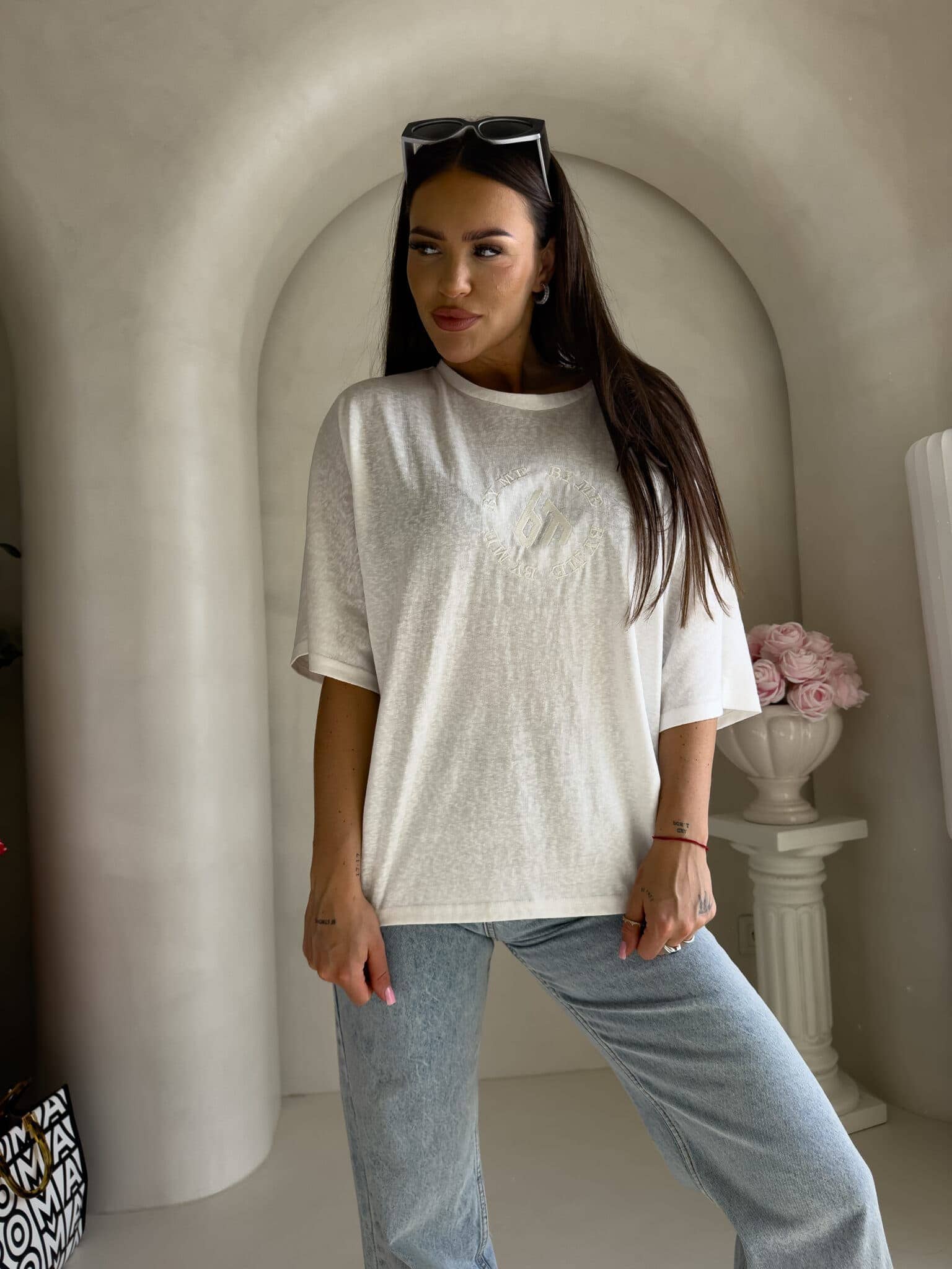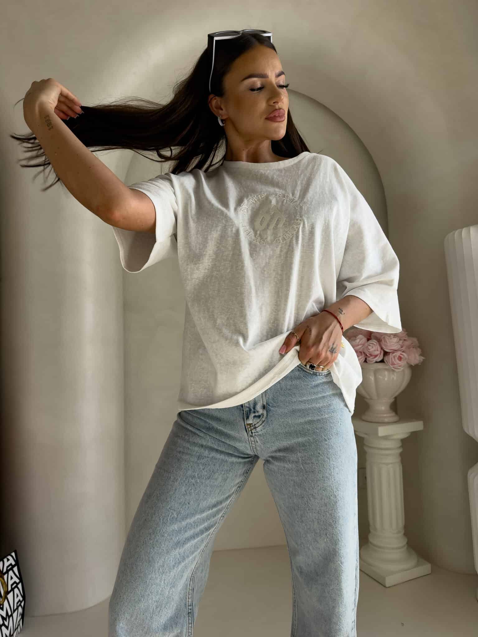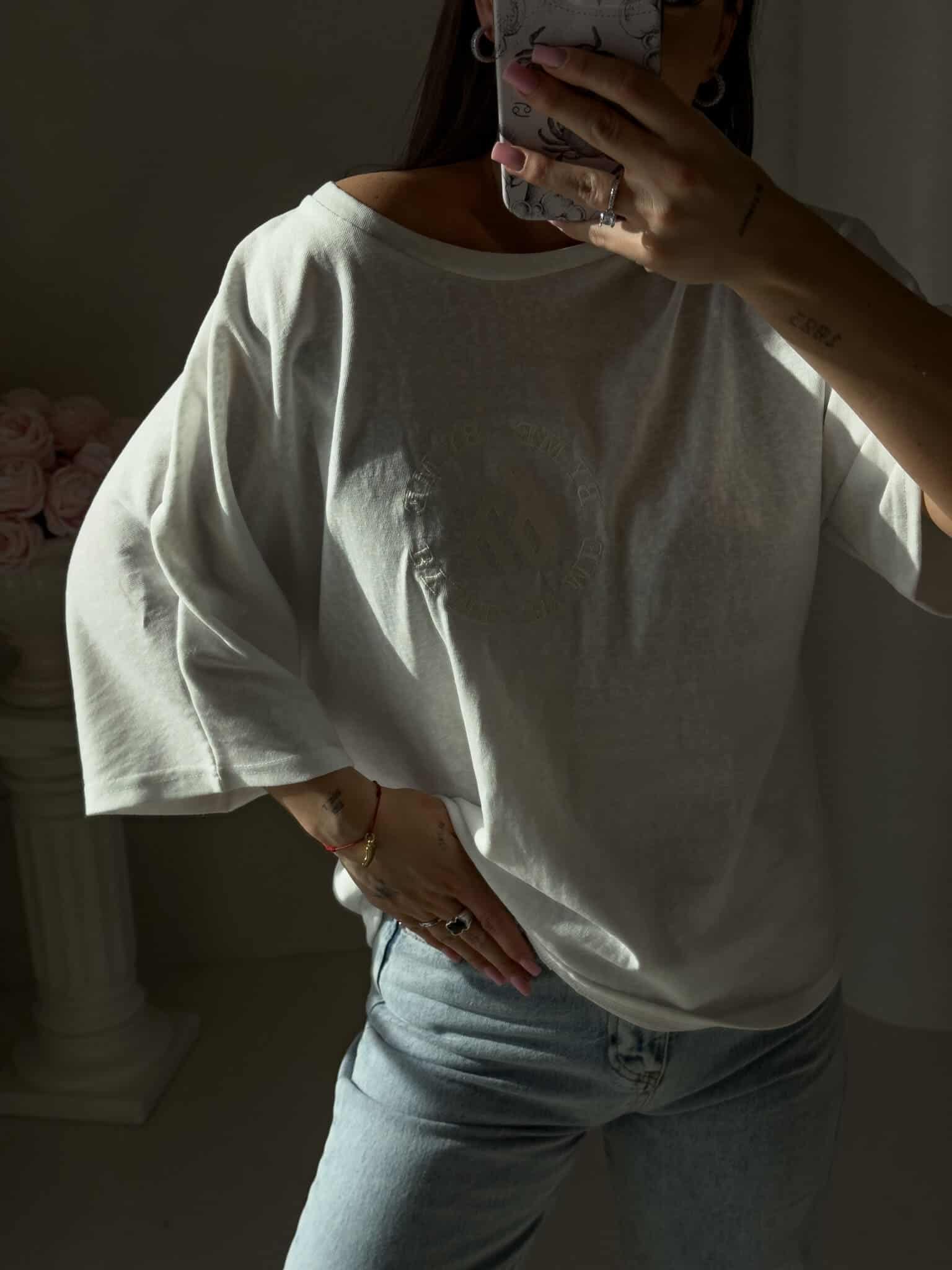 T-shirt o luźnym, oversize’owym kroju z szerokimi rękawami. Na środku znajduje się subtelne logo – okrągły nadruk z napisem „BY ME” oraz minimalistycznym symbolem w środku. Dekolt jest klasyczny, okrągły.