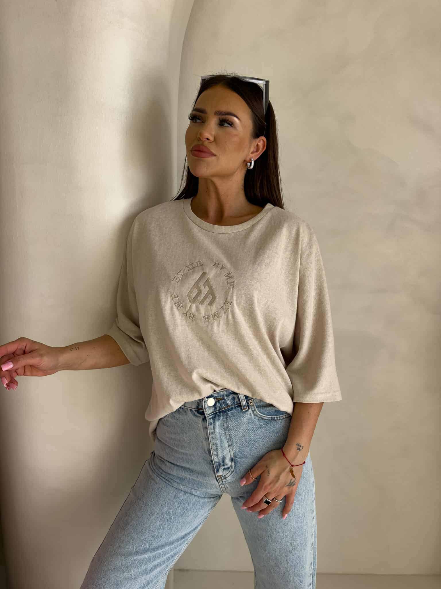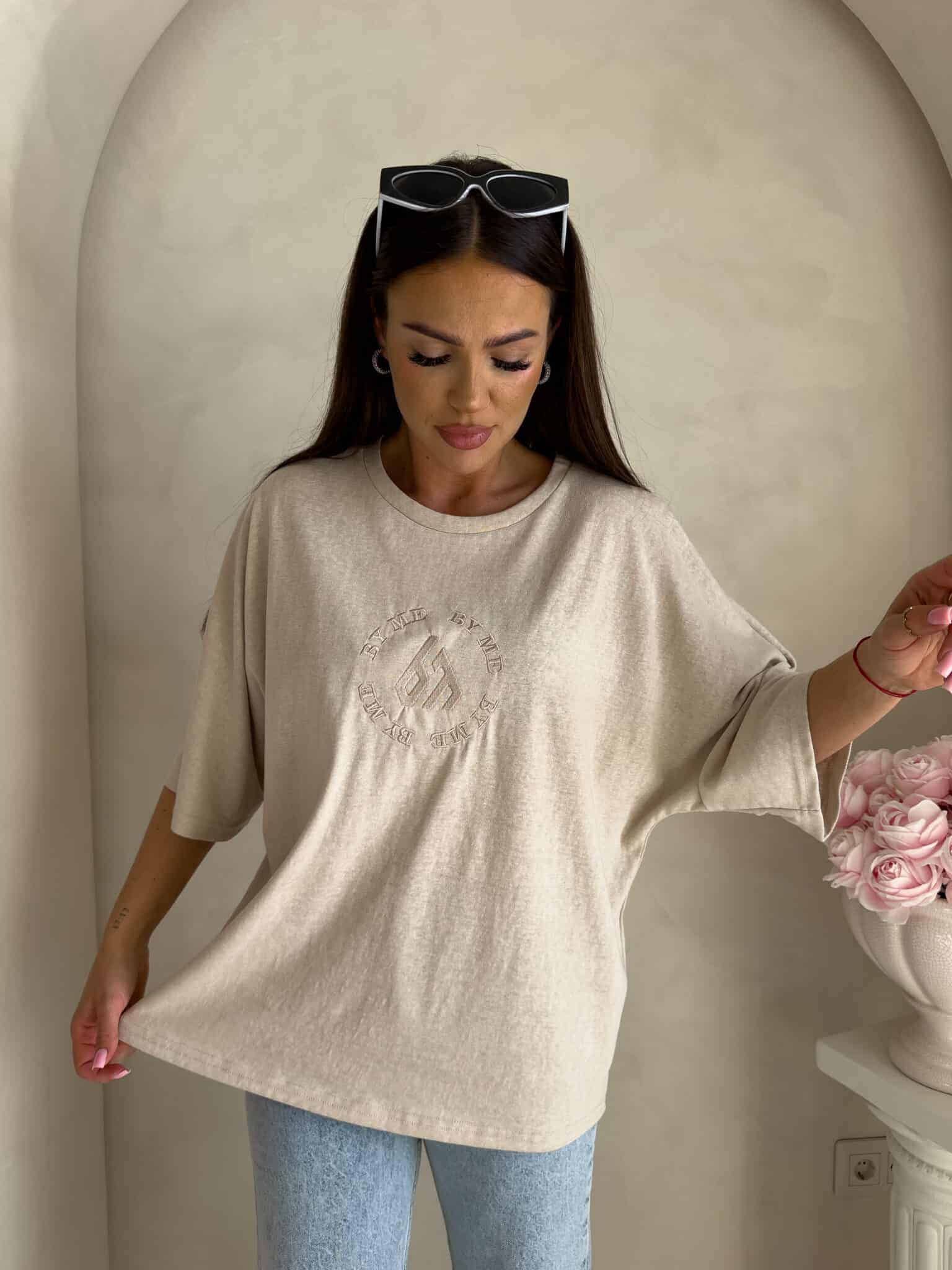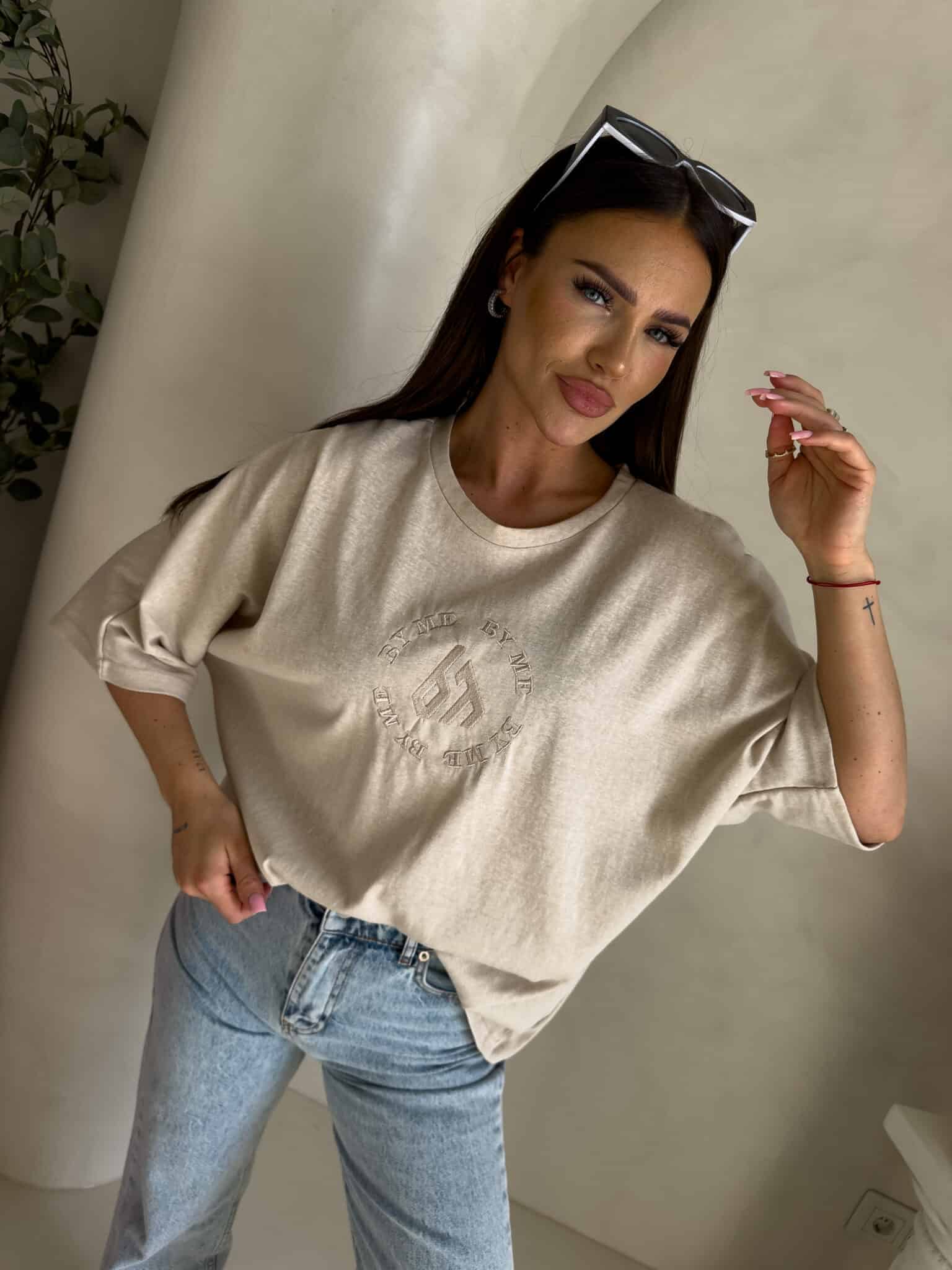 T-shirt o luźnym, oversize’owym kroju z szerokimi rękawami. Na środku znajduje się subtelne logo – okrągły nadruk z napisem „BY ME” oraz minimalistycznym symbolem w środku. Dekolt jest klasyczny, okrągły.