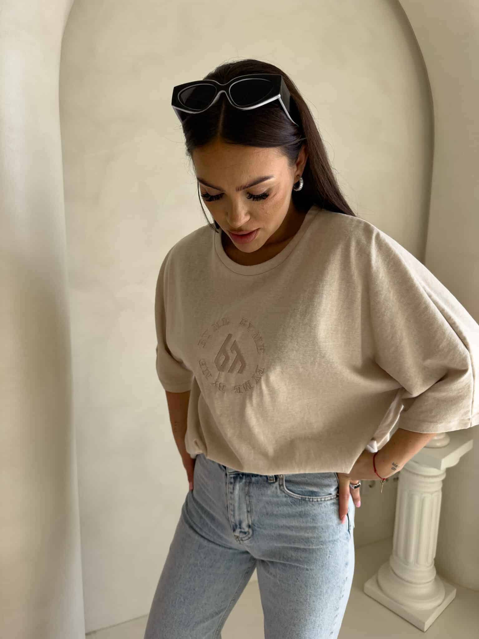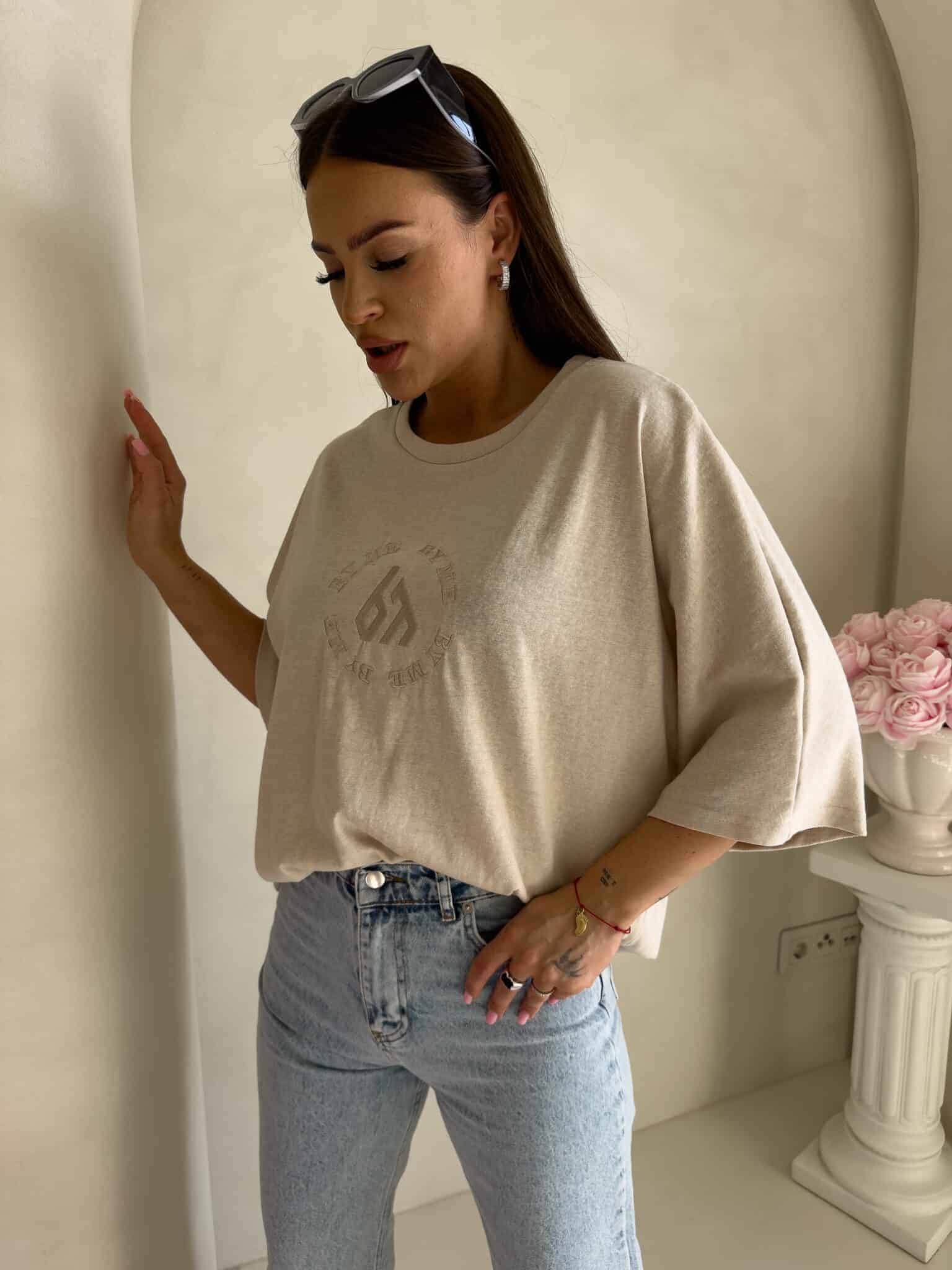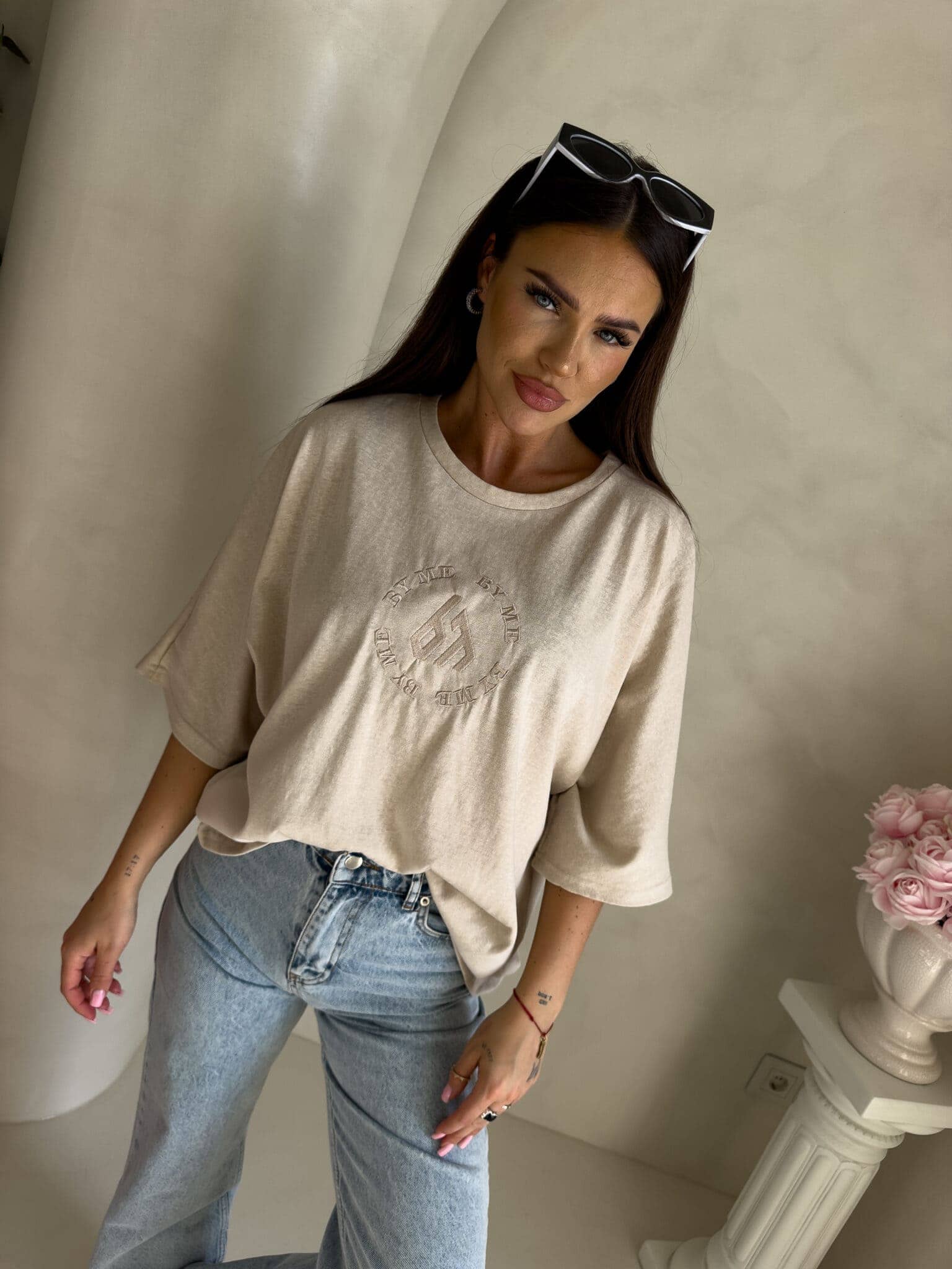 T-shirt o luźnym, oversize’owym kroju z szerokimi rękawami. Na środku znajduje się subtelne logo – okrągły nadruk z napisem „BY ME” oraz minimalistycznym symbolem w środku. Dekolt jest klasyczny, okrągły.
