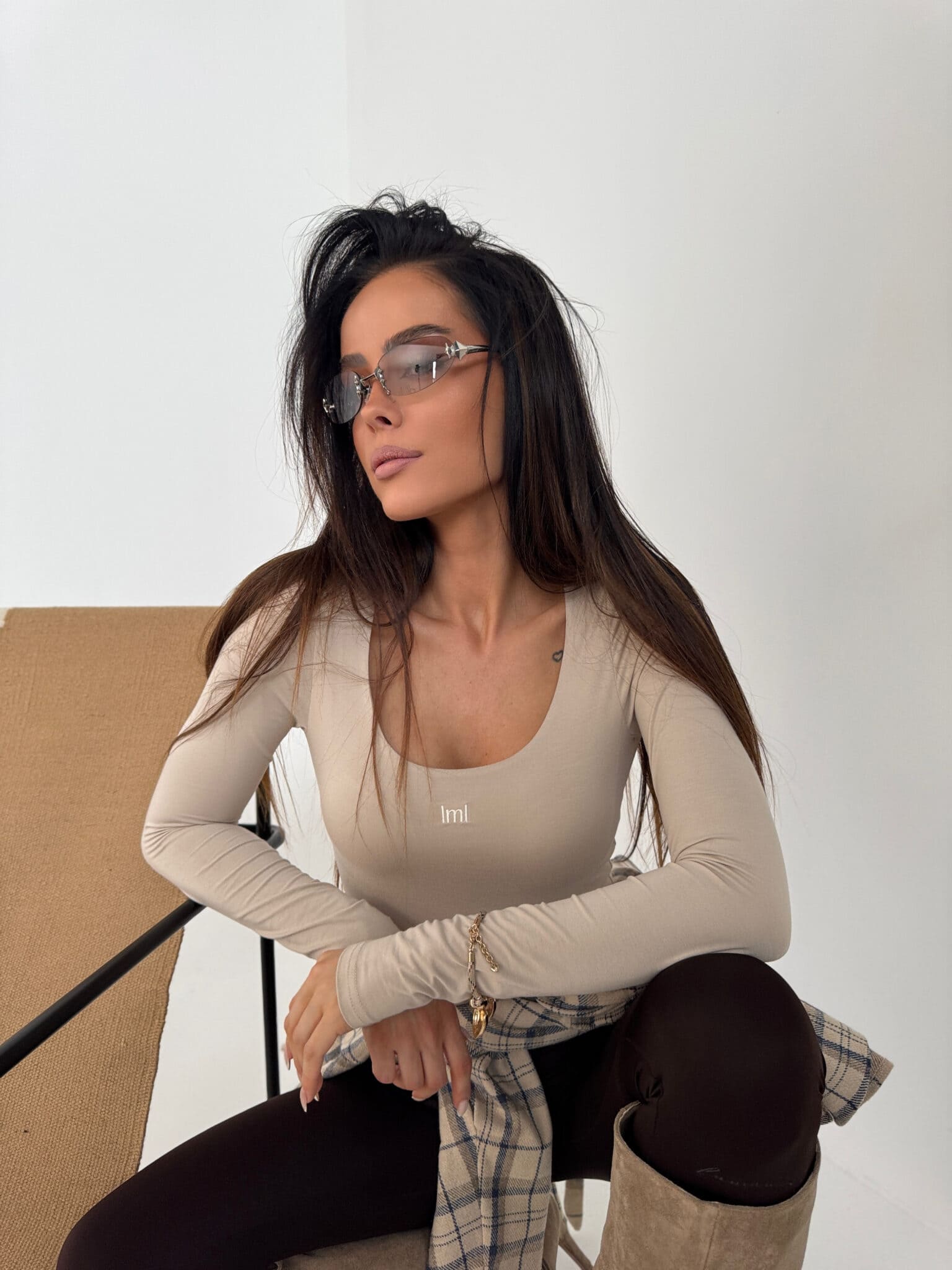 Dopasowany top z długim rękawem i głębokim, zaokrąglonym dekoltem. Wykonany z elastycznej, miękkiej dzianiny, która idealnie przylega do sylwetki. Z przodu drobny haft z logo. Minimalistyczny fason idealny do stylizacji codziennych, sportowych i casualowych.Skład: 95% wiskoza 5% elastan