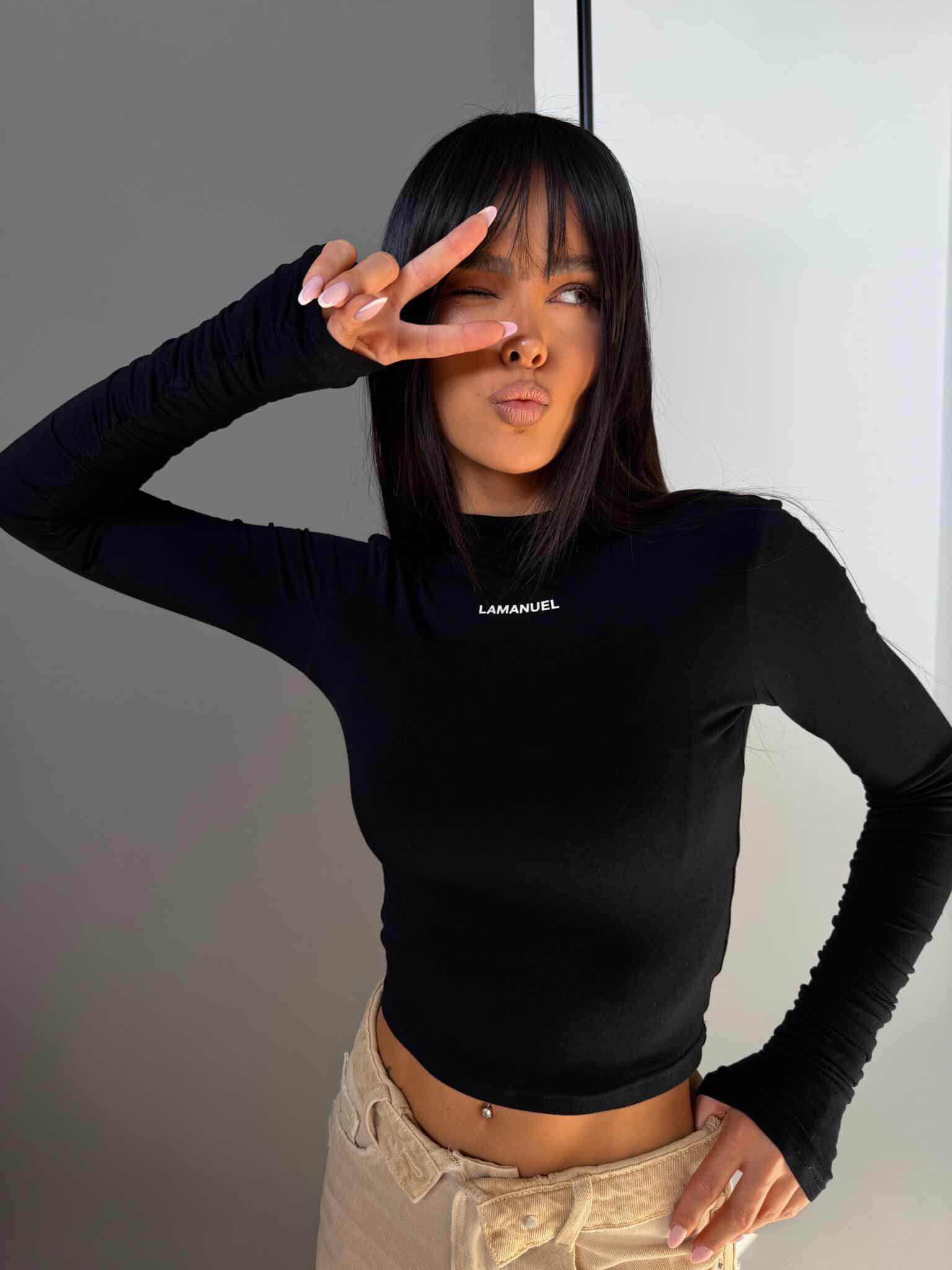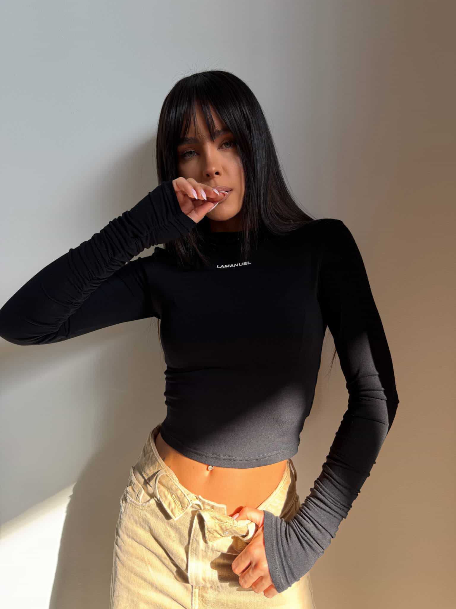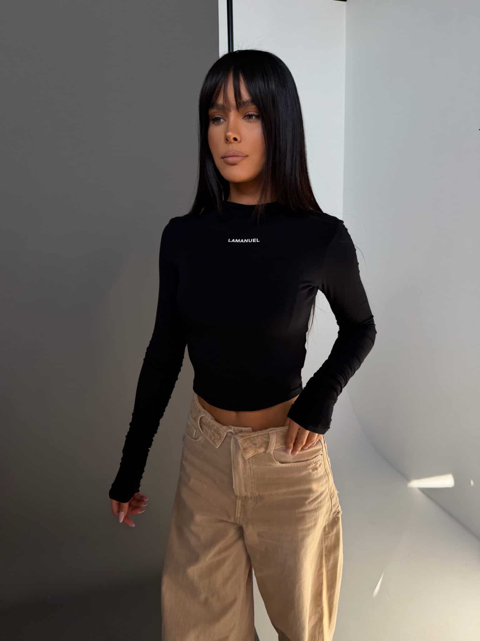 Dopasowany top z długim rękawem wykonany z cienkiej, elastycznej wiskozy, która miękko podkreśla sylwetkę. Minimalistyczna forma została przełamana gumowym nadrukiem logo na wysokości klatki piersiowej, nadając całości nowoczesnego charakteru. Długie rękawy z delikatnym marszczeniem dodają lekkości i sprawiają, że model wyróżnia się na sylwetce. Prosty, kobiecy fason, który mocno akcentuje figurę i świetnie wygląda noszony solo.Skład: 95% wiskoza 5% elastan