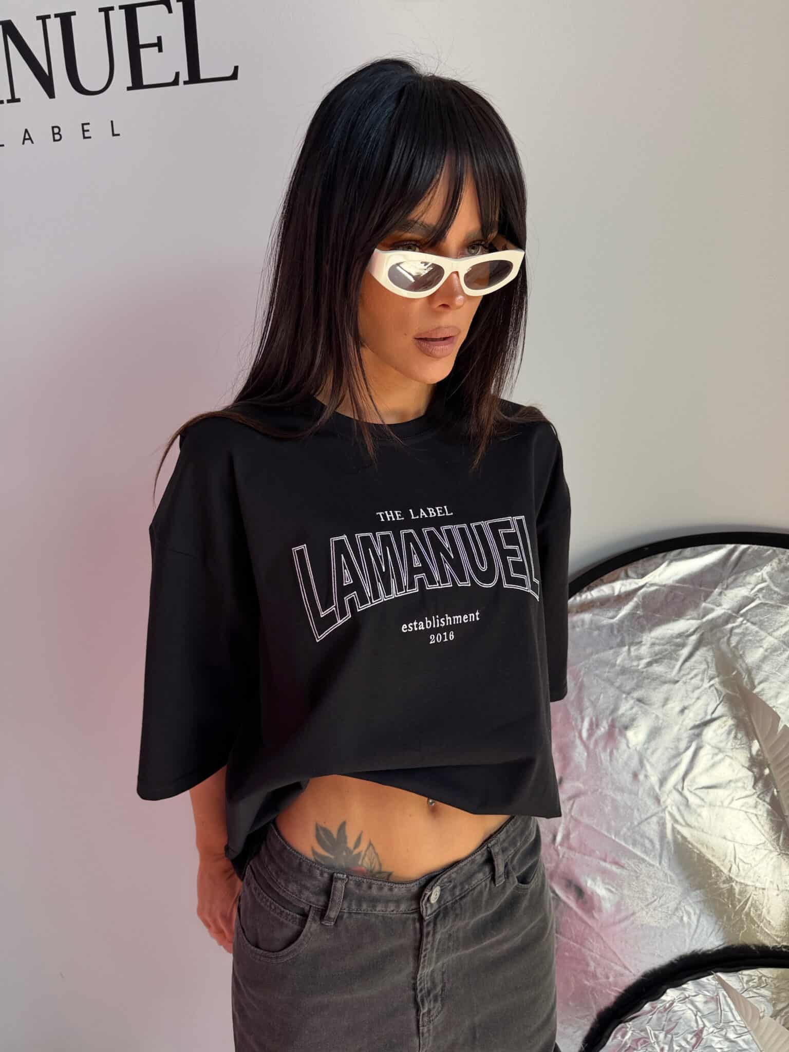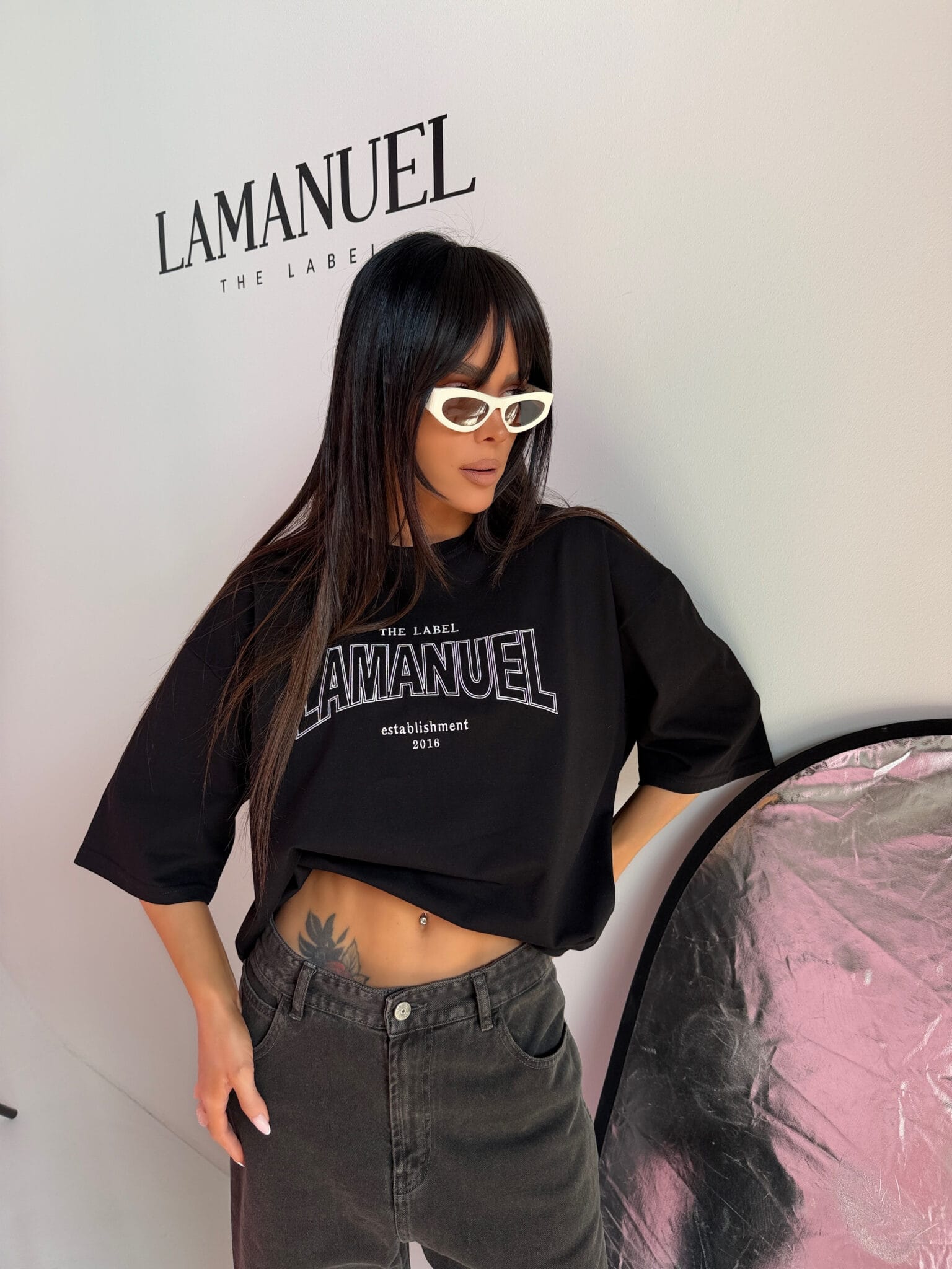 Oversize’owy t-shirt wykonany z wysokiej jakości bawełny. Model z wydłużonym rękawem, zapewniający komfort i swobodę noszenia. Na przodzie subtelne, tłoczone logo LAMANUEL z napisem „The Label” i „est. 2016”. Klasyczny fason w nowoczesnym, minimalistycznym wydaniu.Skład: 100% bawełna