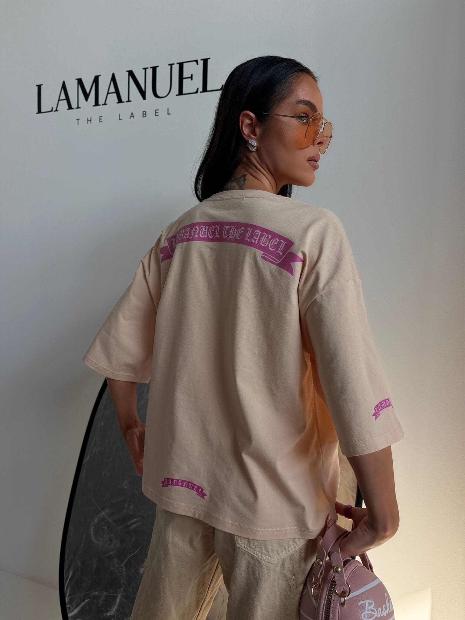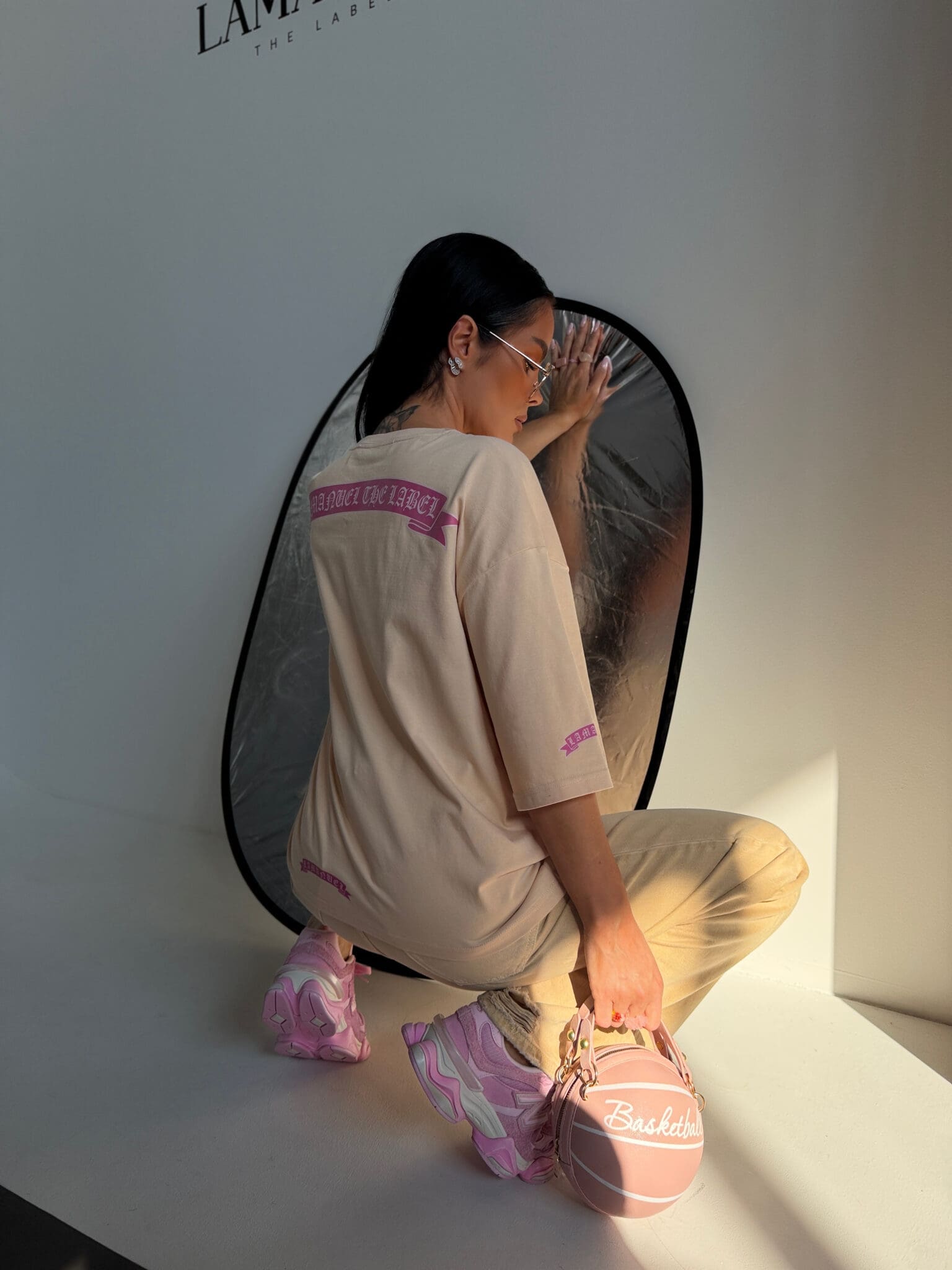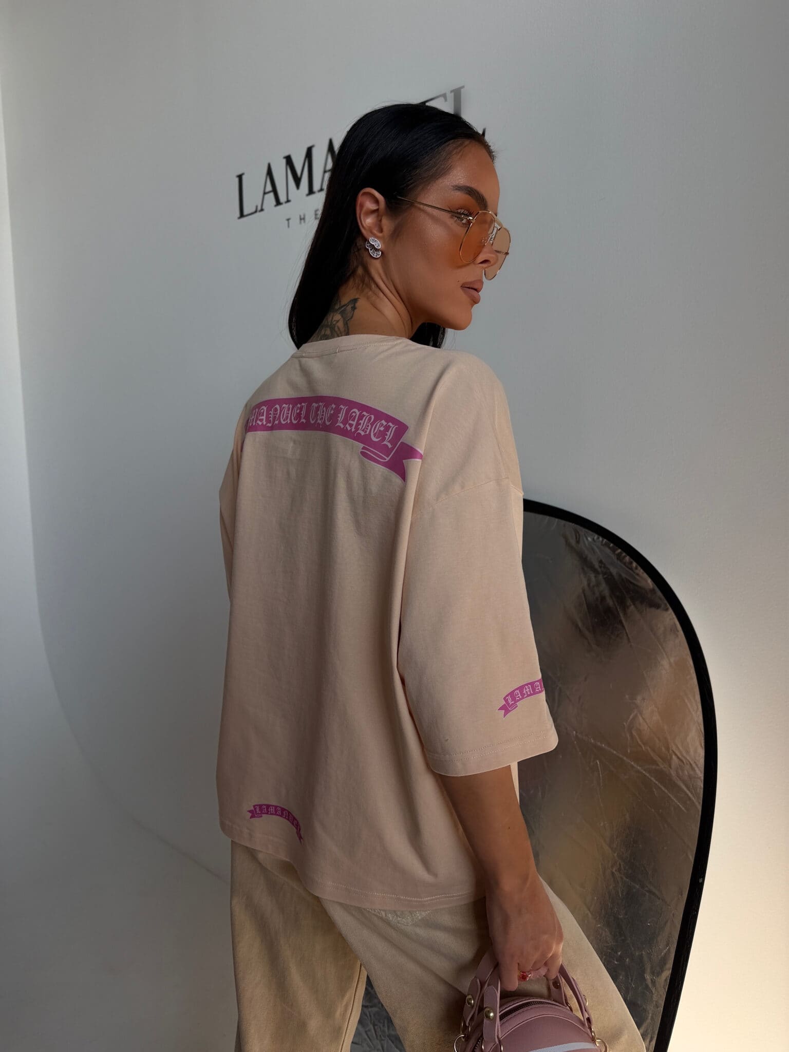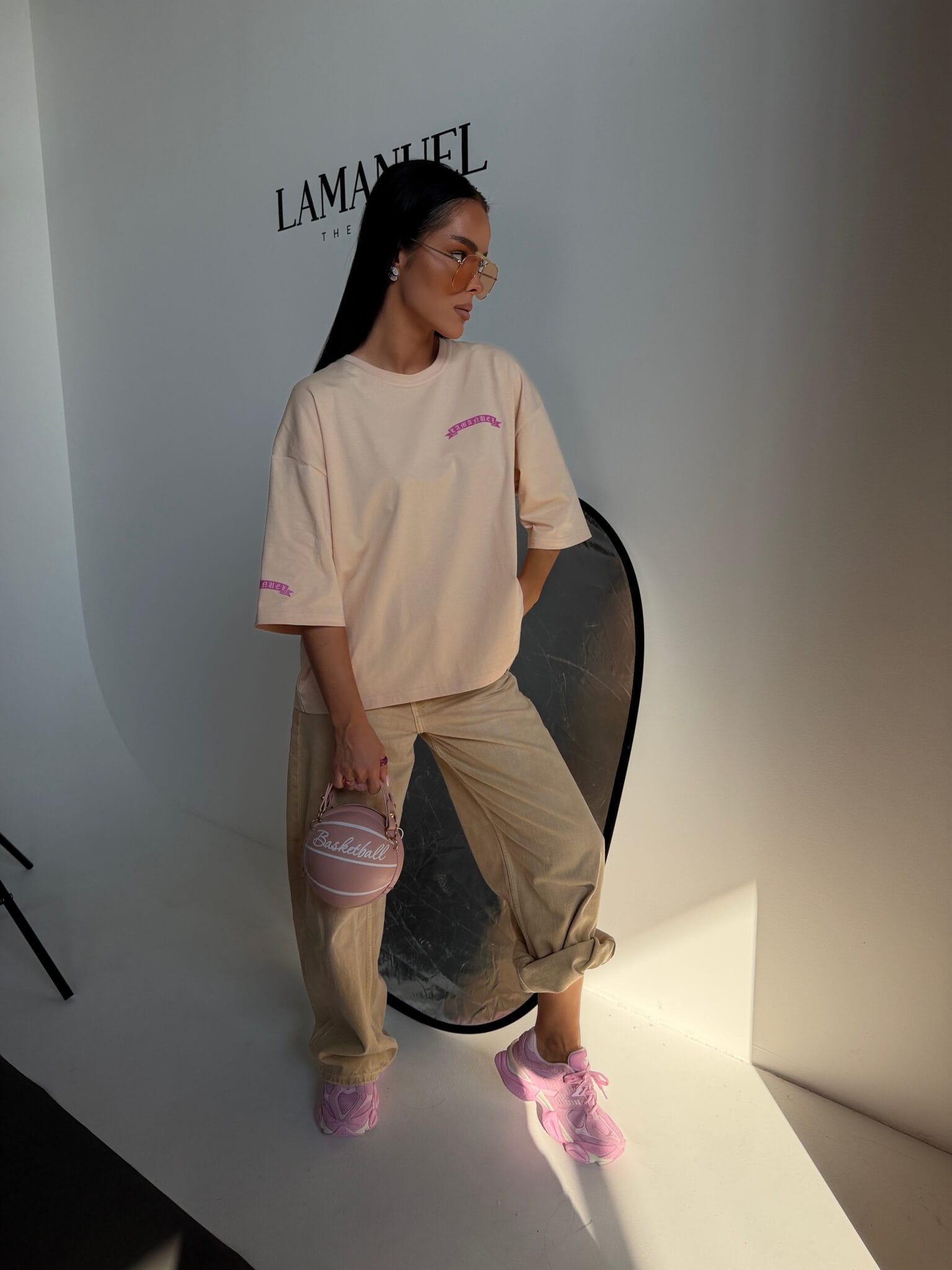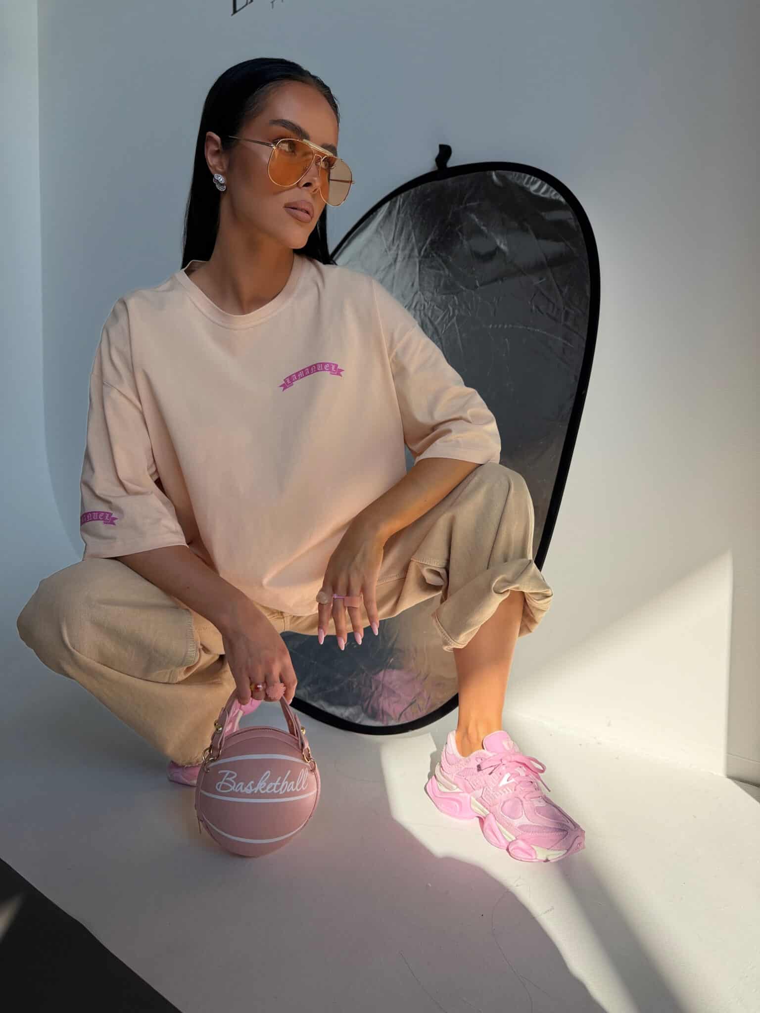 T-shirt o luźnym, oversize’owym kroju, wykonany z miękkiej, przyjemnej w dotyku bawełny. Model z krótkim rękawem i obniżoną linią ramion, który zapewnia swobodę i naturalnie układa się na sylwetce. Charakterystycznym elementem są rozmieszczone detale graficzne na przodzie, plecach i rękawie, tworzące spójny, wyrazisty look. Nowoczesna forma i dopracowane wykończenie nadają całości modowego charakteru.Skład: 100% bawełna