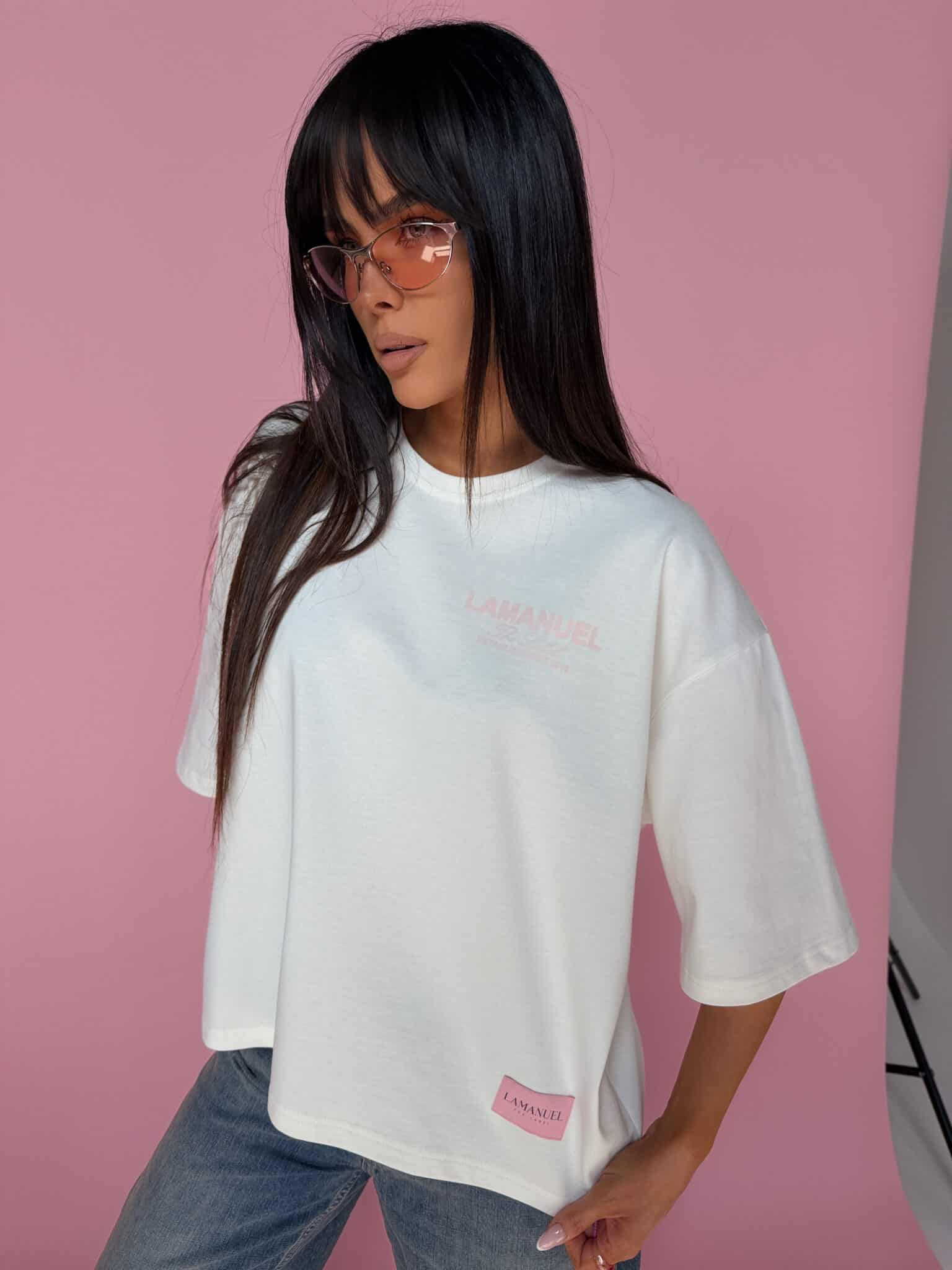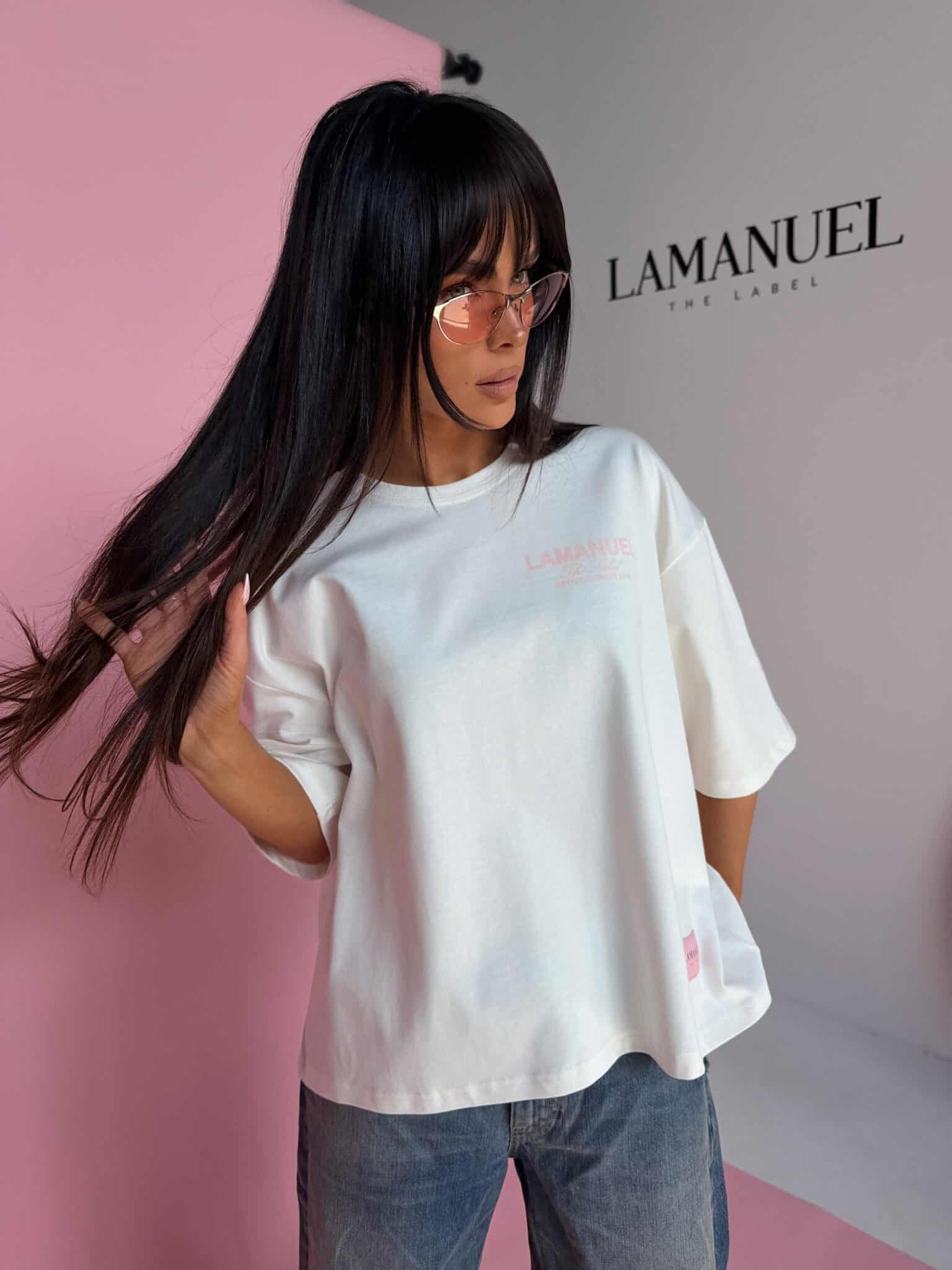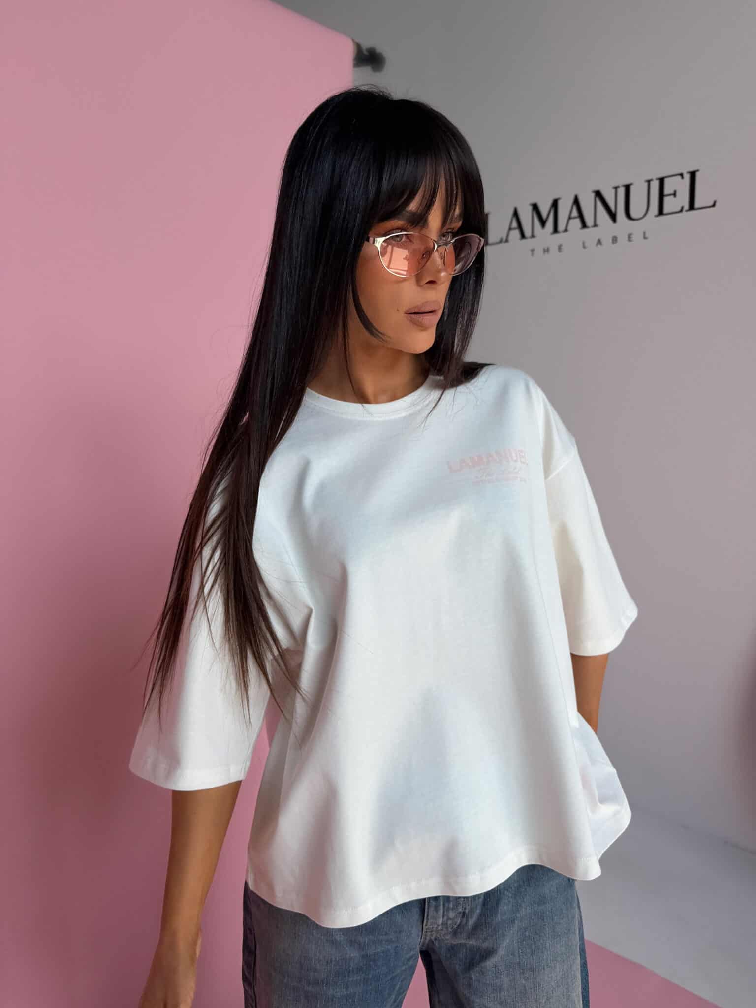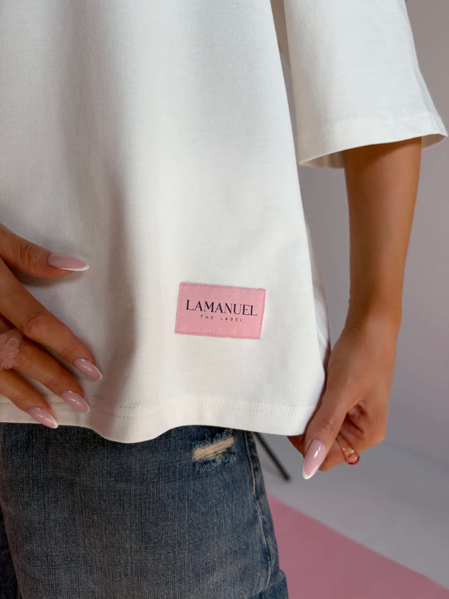 Oversize’owy t-shirt wykonany z wysokiej jakości bawełny. Model z wydłużonym rękawem i obniżoną linią ramion. Na przodzie subtelne logo, z tyłu duży nadruk LAMANUEL the label. Dodatkowo naszywka z logo przy dole. Nowoczesny, brandowy charakter w minimalistycznym wydaniu.Skład: 100% bawełna