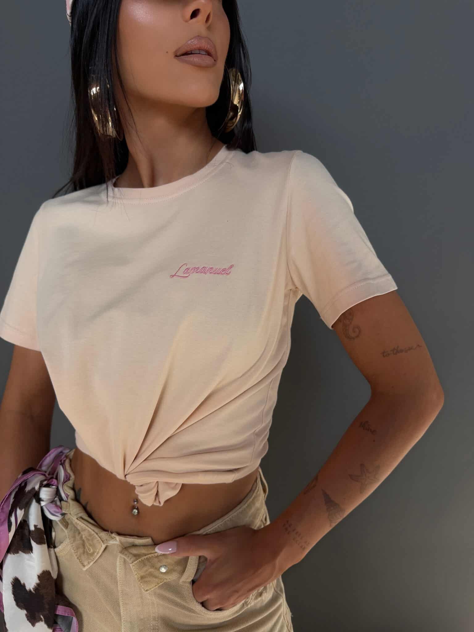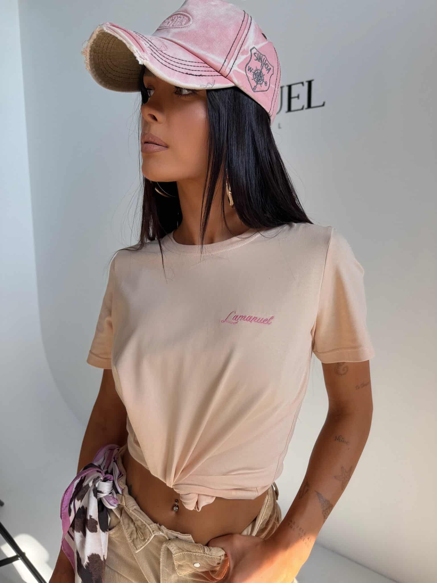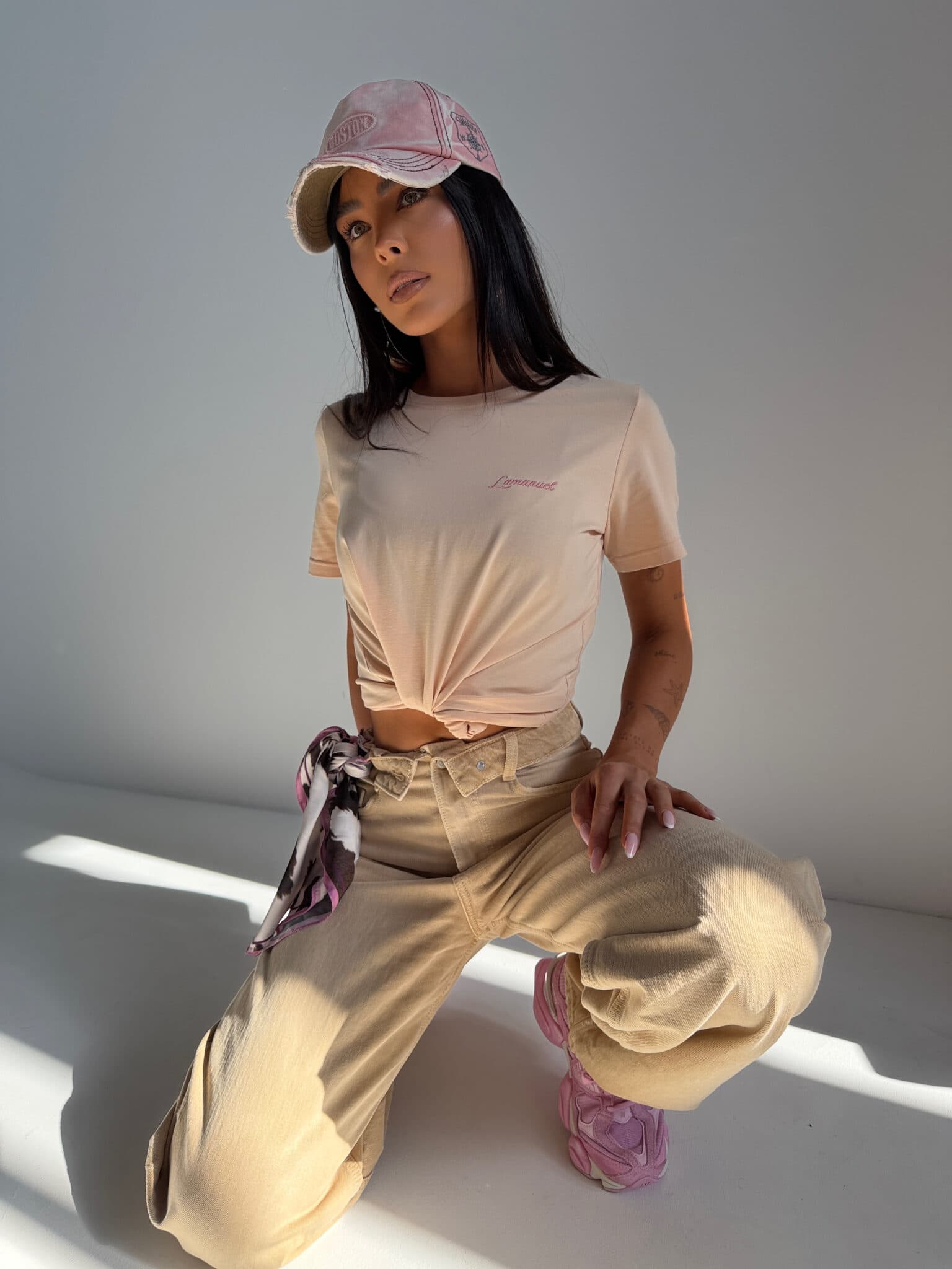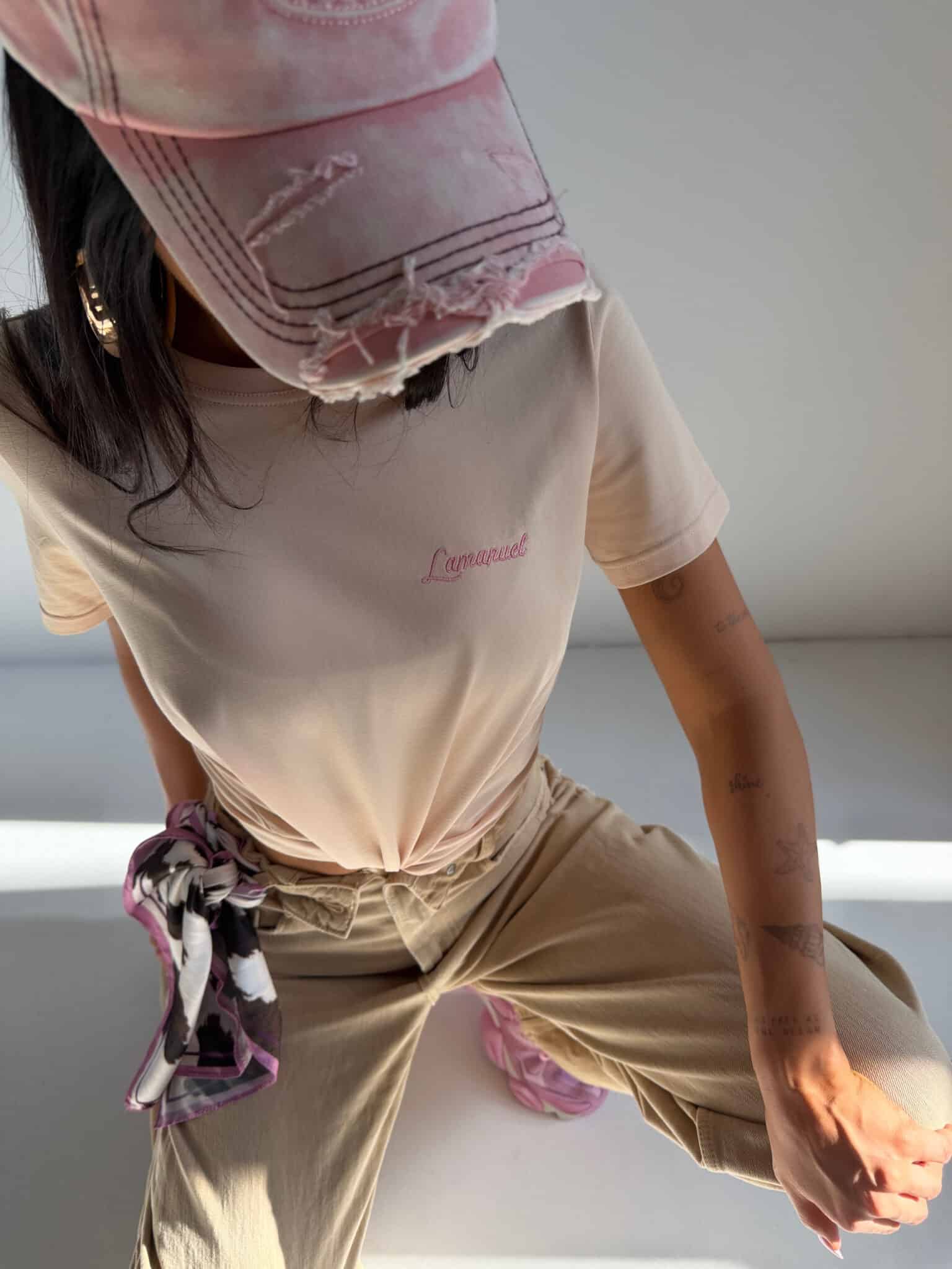 Dopasowany t-shirt o klasycznej, dłuższej formie z miękkiej, przyjemnej w dotyku dzianiny. Minimalistyczny krój przełamuje subtelny haft logo, który dodaje całości charakteru. Materiał miękko układa się na sylwetce, dzięki czemu model można nosić zarówno swobodnie, jak i stylizować bardziej kobieco — wiązany, podwinięty lub wpuszczony w spodnie. Prosty fason, który daje wiele możliwości stylizacji.Skład: 100% bawełna