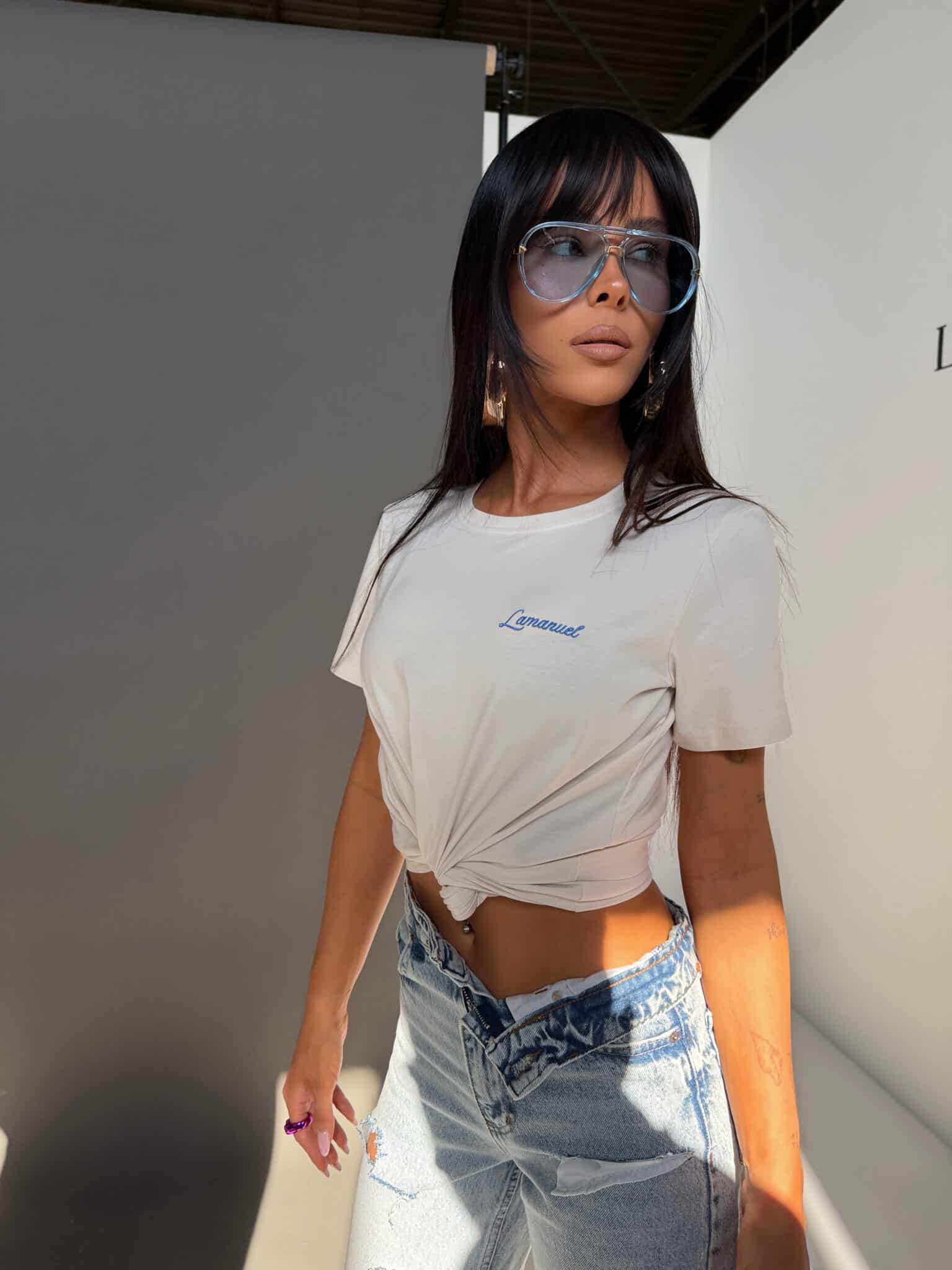 Dopasowany t-shirt o klasycznej, dłuższej formie z miękkiej, przyjemnej w dotyku dzianiny. Minimalistyczny krój przełamuje subtelny haft logo, który dodaje całości charakteru. Materiał miękko układa się na sylwetce, dzięki czemu model można nosić zarówno swobodnie, jak i stylizować bardziej kobieco — wiązany, podwinięty lub wpuszczony w spodnie. Prosty fason, który daje wiele możliwości stylizacji.Skład: 100% bawełna