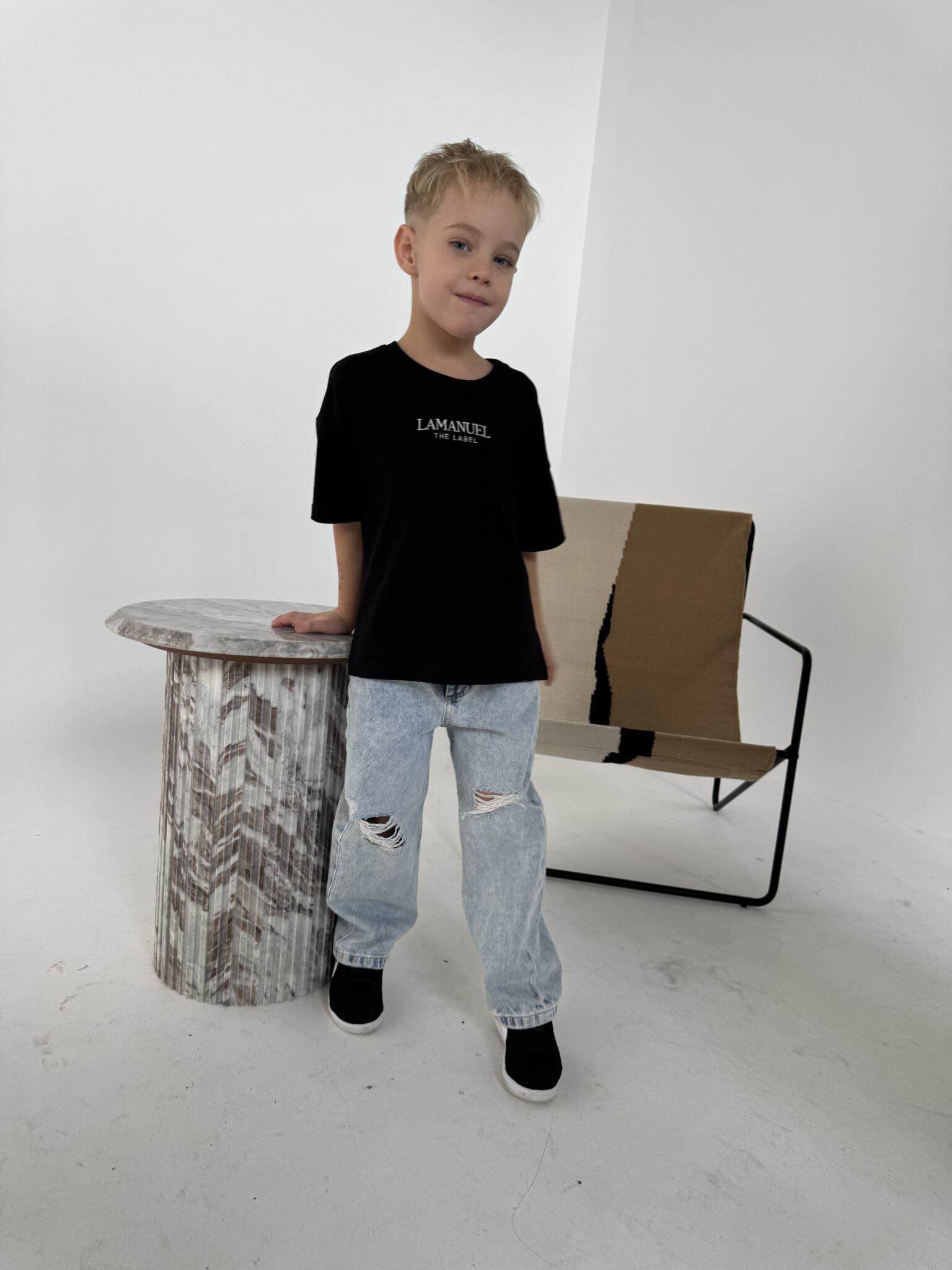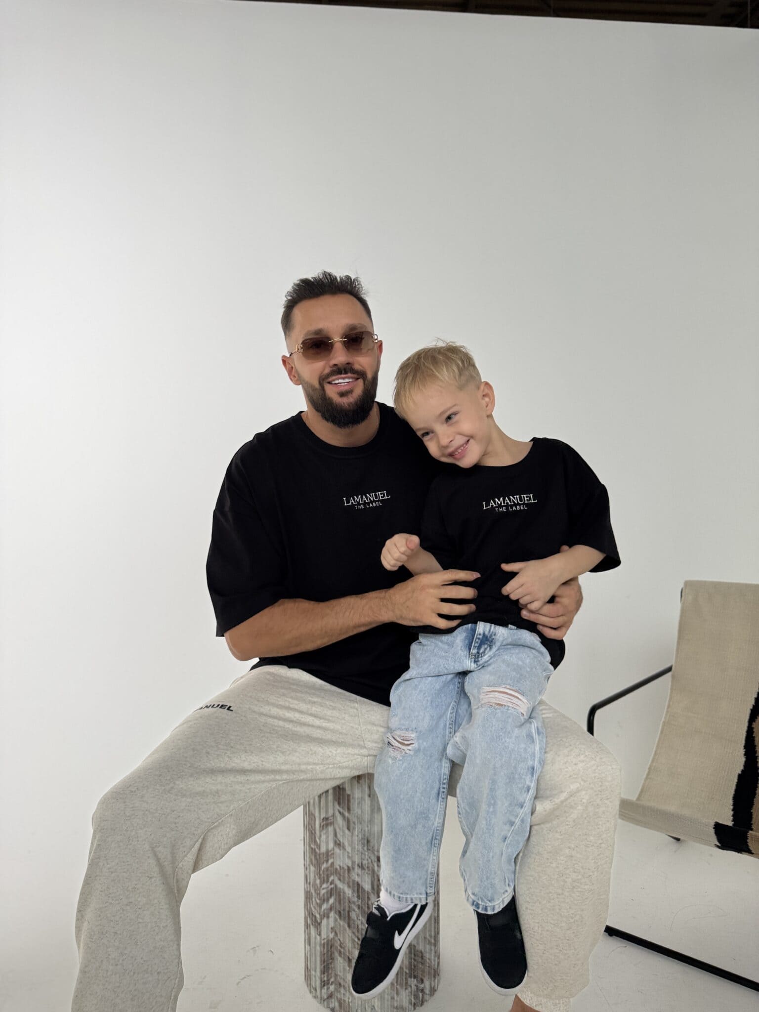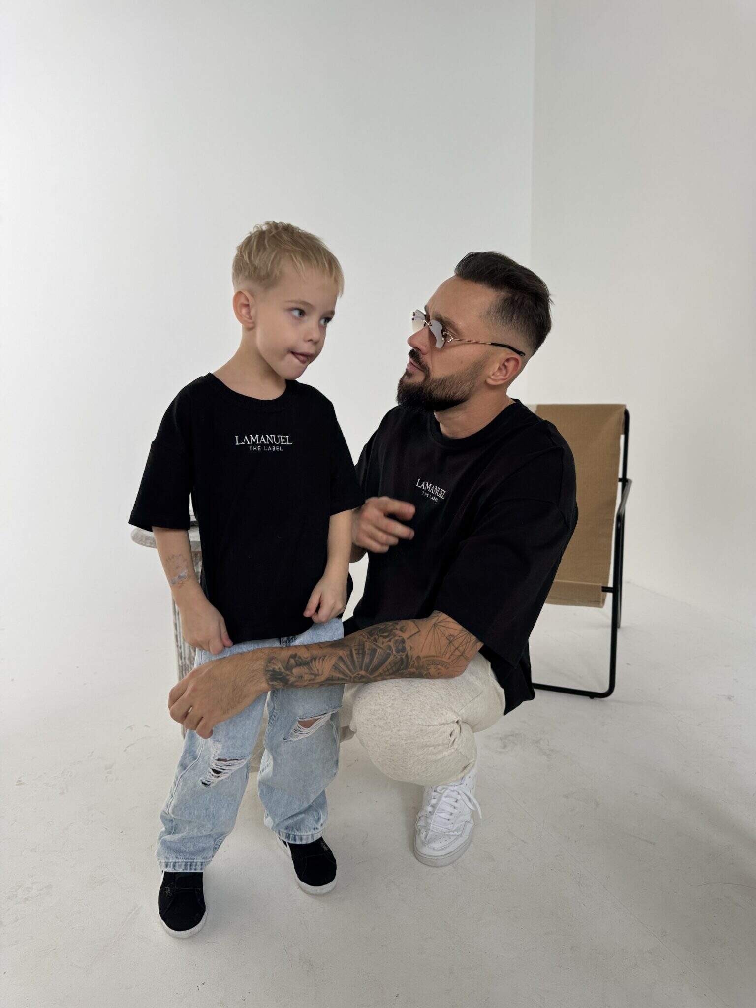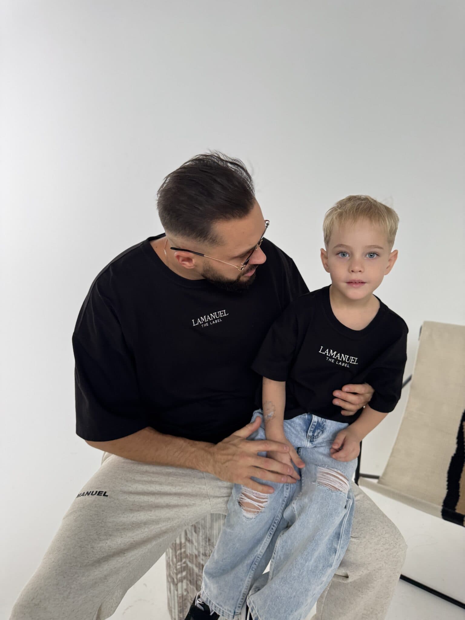 Uroczy t-shirt w stylu oversize, uszyty z przyjemnej w dotyku bawełny. Z przodu haft z logo LAMANUEL – mini wersja dorosłego modelu. Komfortowy i trwały, idealny do zestawu rodzinnego matchy.Skład: 100% bawełna